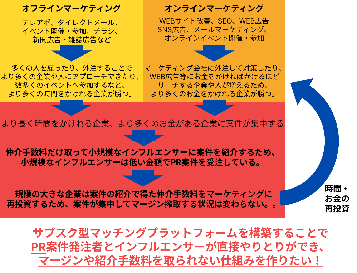 「インフルエンサー/Youtuber と 商品/イベント等をPRしたい企業/団体/個人等」のマッチング、もしくは「インフルエンサー/Youtuber同士」でコラボができるプラットフォームを低価格の月額制で提供し、マージンや紹介手数料を完全無料にすることでインフルエンサー向けのPR案件の受発注やコラボを活性化したいと考えております。
