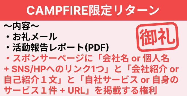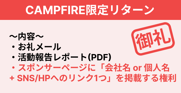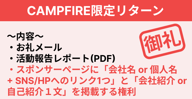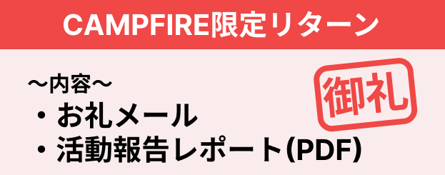 本プロジェクトはAll-or-Nothing方式で実施します。目標金額に満たない場合、計画の実行及びリターンのお届けはございません。