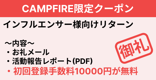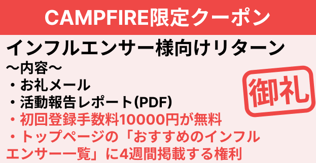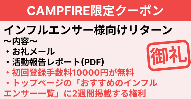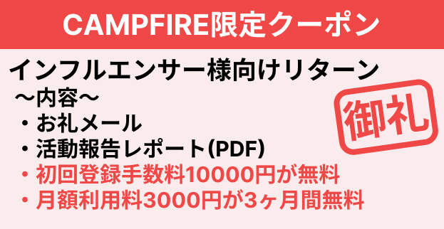 お礼メール + 活動報告レポート(PDF) + 初回登録手数料1万円が無料 + マッチングプラットフォームのトップページの「おすすめのインフルエンサー一覧」に2週間掲載する権利