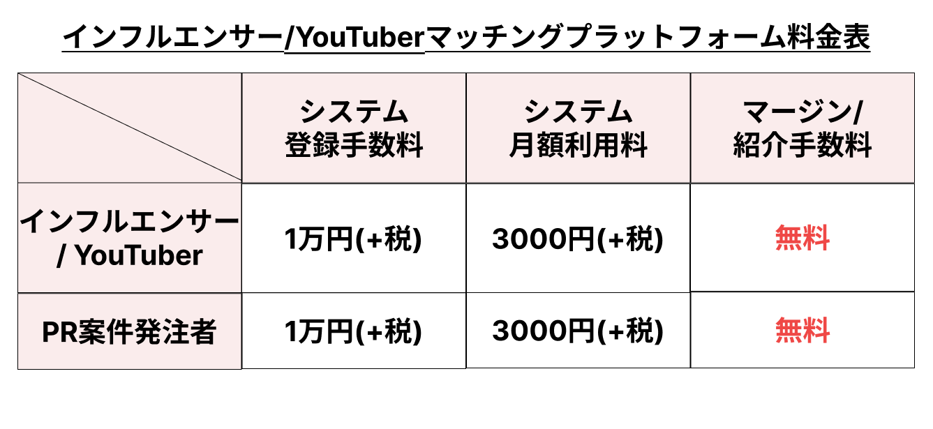 インフルエンサー/Youtuber同士のコラボを活性化し、よりフォロワー数の多いインフルエンサーになれるようにすることが目的のため、PR案件の受発注と同様にマージンは無し、コミュニケーションや契約・発注業務がスムーズに行われるよう制限はなるべく少なくなるようにします。