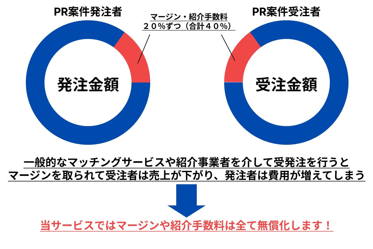 インフルエンサー/Youtuber同士のコラボを活性化し、よりフォロワー数の多いインフルエンサーになれるようにすることが目的のため、PR案件の受発注と同様にマージンは無し、コミュニケーションや契約・発注業務がスムーズに行われるよう制限はなるべく少なくなるようにします。