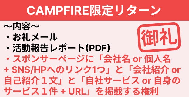 お礼メール + 活動報告レポート(PDF) + マッチングプラットフォームのスポンサーページの3段目に「会社名 or 個人名 + SNS/HPへのリンク1つ」を1年間掲載する権利