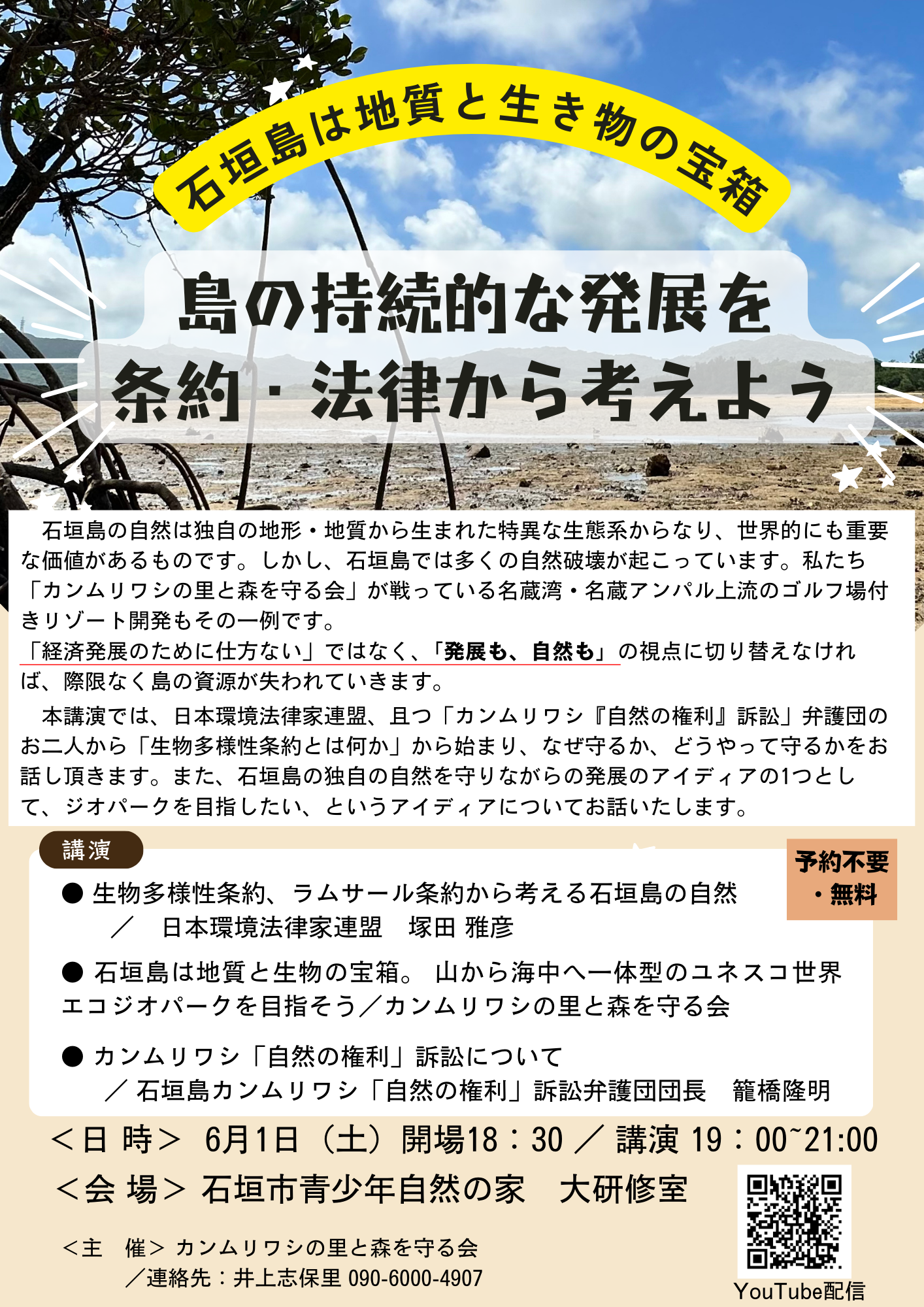 本講演では、日本環境法律家連盟、且つ「カンムリワシ『自然の権利』訴訟」弁護団のお二人から「生物多様性条約とは何か」から始まり、なぜ守るか、どうやって守るかをお話し頂きます。現在進行中の訴訟戦略についても解説いただきながら、石垣島の独自の自然を守りながらの発展のアイディアの1つとして、ジオパークを目指したい、というアイディアについてお話いたします。島の発展について共に考えましょう。