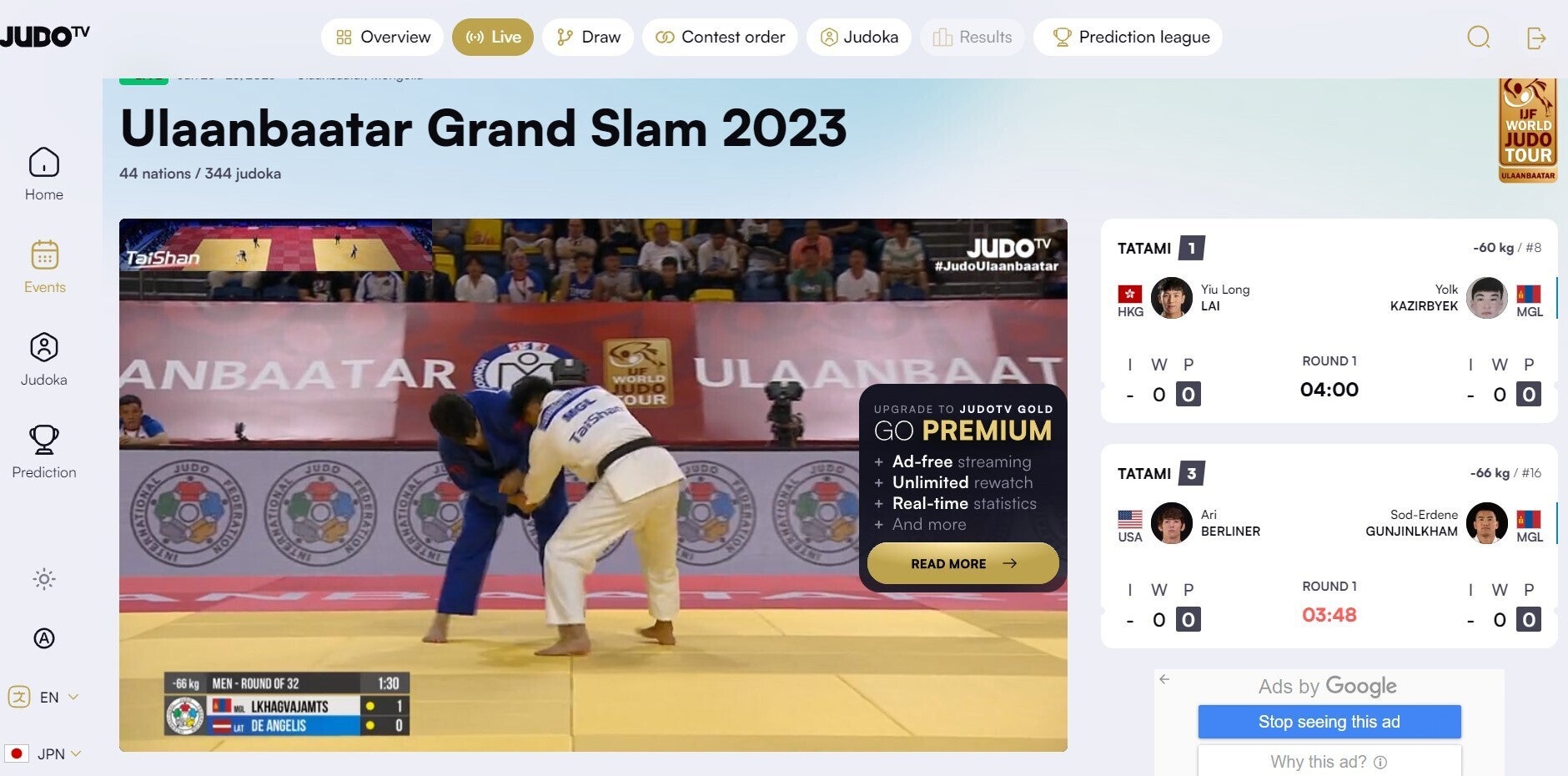 試合は国内でのテレビ放送の予定は見当たりませんが、国際柔道連盟のウエブサイトでライブ配信されており、アカウント登録をすると予選(ときには決勝リーグも)無料で見ることができます。