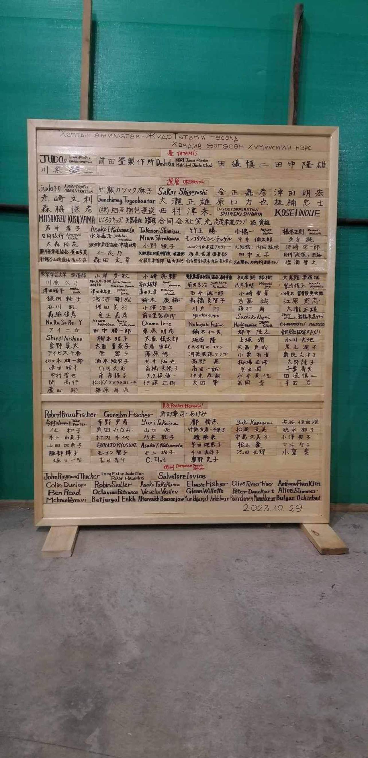 リターンでお名前を道場に表示を選んでくださった皆様ご協力くださった皆様大変お世話になっております。プロジェクト事務局です。昨年は本当にお世話になりました。改めてありがとうございました。モンゴルのほうで木製の名札や名札掛けを制作いただき、上記の写真の通り、お名前や団体名を掲示させていただきました。改めてご支援くださり、本当にありがとうございました!※2024年9月モンゴルに行って柔道しよう!1/27(土)オンライン説明会また、本プロジェクトでは、昨年末にご報告した通り、今年9月、モンゴルに行って、日本から贈った畳が敷かれた道場を見たり、柔道大会に参加したり、柔道交流をしたり、観光したりする機会を作れたらと思っております。その説明会をオンライン上で2024年1月27日(土)11:00-12:00で開催しますので、是非お気軽にお越しください。参加ご希望者はこちらのフォームにご記入ください。記入したメールアドレスにビデオ会議のリンクが送信されます。詳細は以下をご覧ください。2024年9月モンゴルに行って柔道をしませんか?1/27(土)オンライン説明会今年も何卒よろしくお願いいたします。