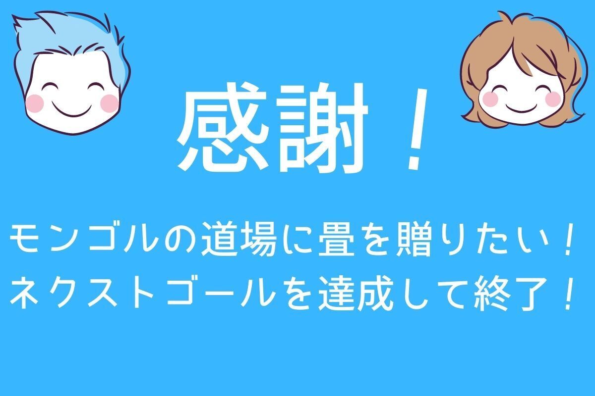 みなさま6月1日から始まったクラウドファンディング、ご支援のおかげで当初の目標、そしてネクストゴールを達成することができました。この1か月、一緒に走ってくださり、気にかけてくださり、プロジェクトをカタチにして実行できるようにしてくださり、本当に感謝です。改めて、温かいご支援、本当にありがとうございました!これから張り切ってプロジェクトを進めていきたいと思います。取り急ぎ、お礼まで。「モンゴルの道場に畳を贈りたい!」プロジェクトメンバー一同より