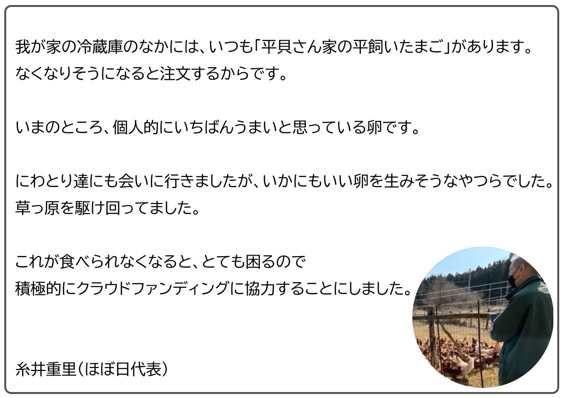 このプロジェクトを通して、もっと多くの方々に「平飼いたまご」を知っていただきたい。食べていただきたい。と思っております。