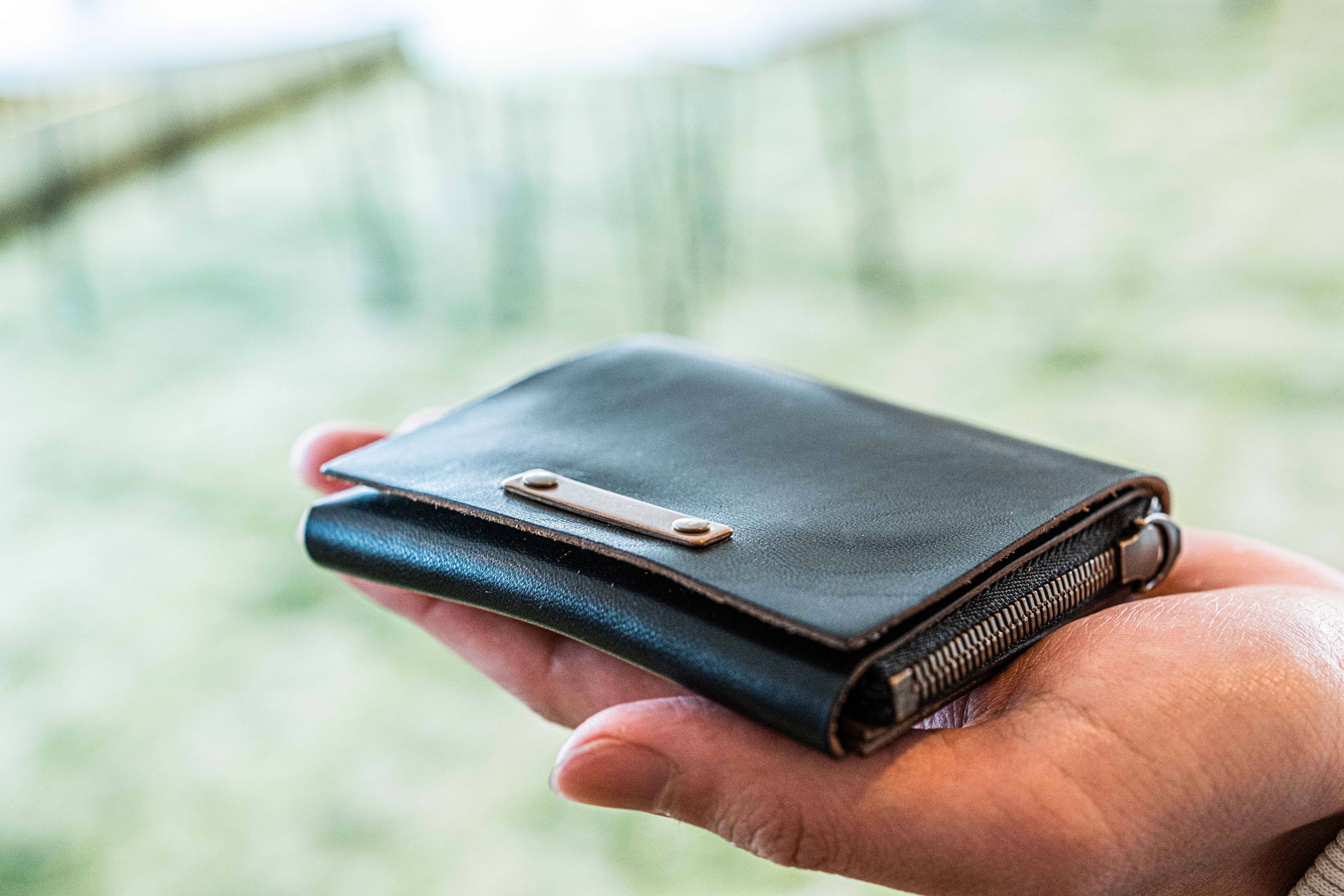 サブフラップは指がかかりやすく、ボタン周りの革に負担が少ない形状。ほどよい厚みのおかげで、コインを手前に出すときの受け皿としても機能します。