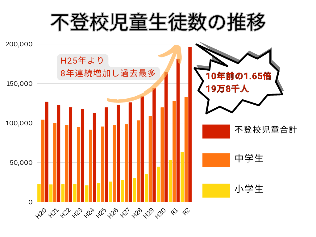 一方、全国の不登校児童生徒数は8年連続で増加し、過去最多となりました。
