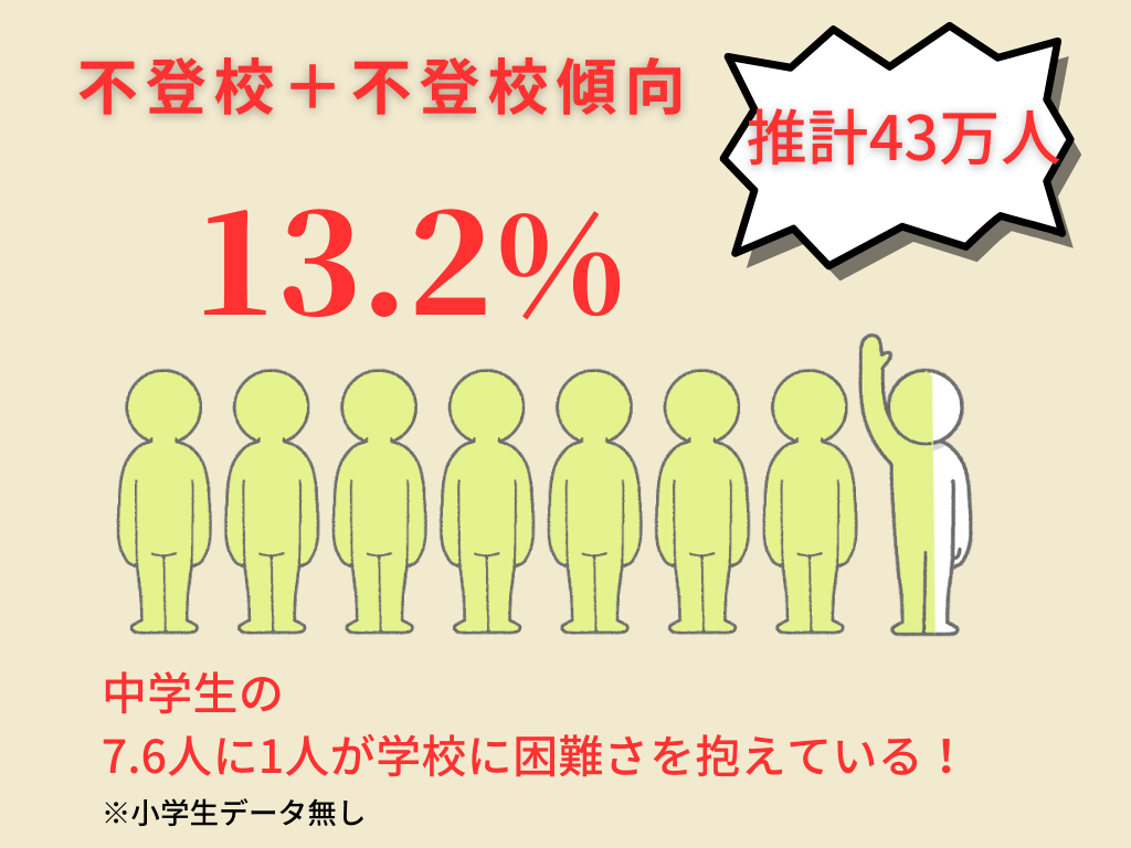 文科省の調べによると、不登校傾向にある中学生(小学生データ無し)と合わせると43万人もの生徒が学校に対し困難さを抱えているのです。