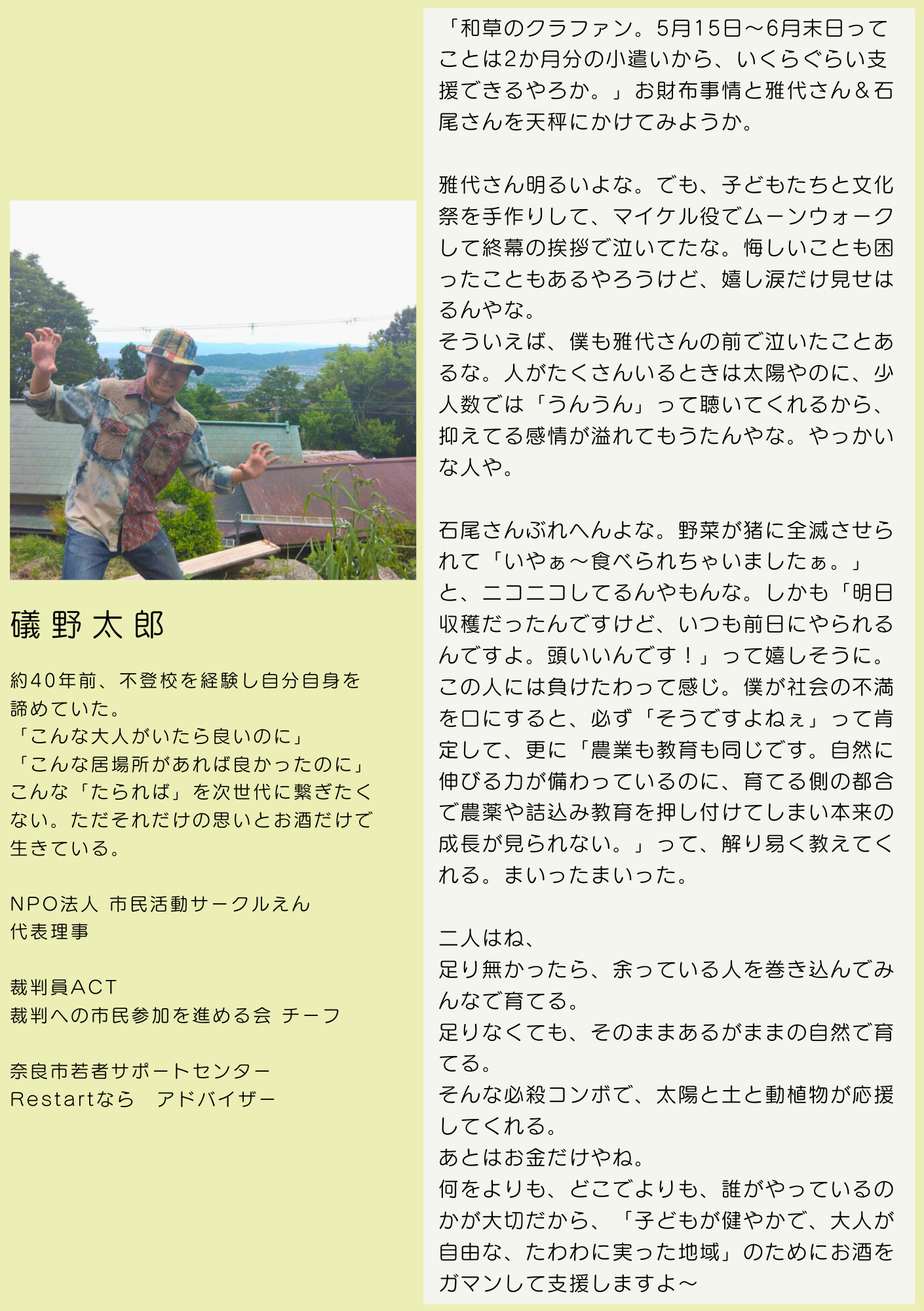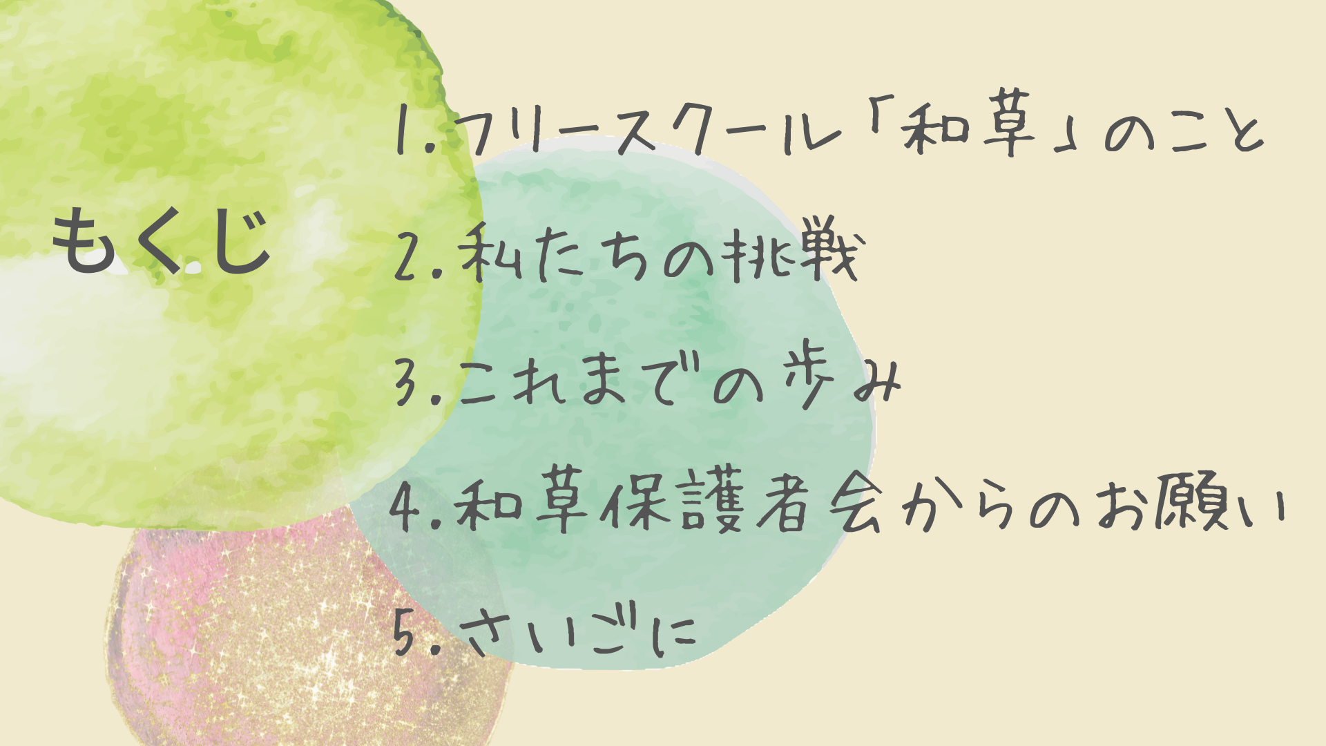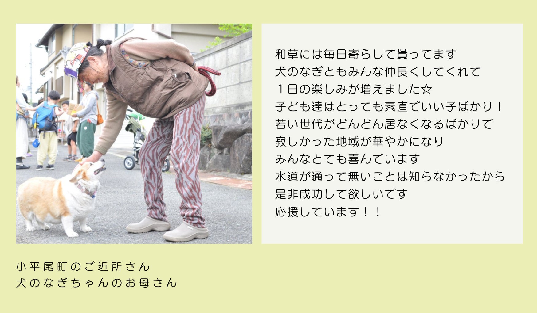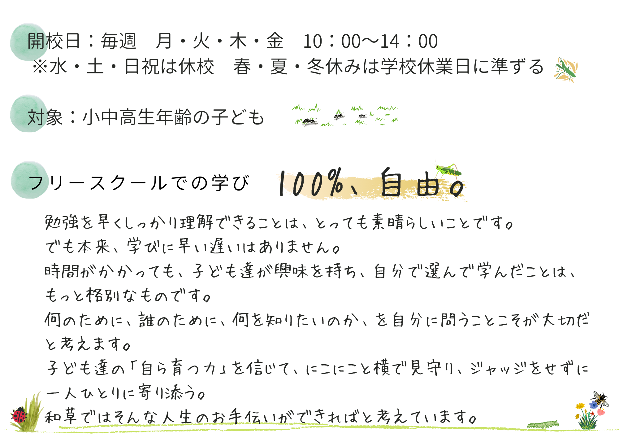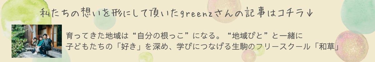 カリキュラムのない和草で私たち大人が出来ることは将来自分のルーツとなる経験を、地域の人と共に重ねる環境を整える事です。子どもたちのより深い学びと地域活性化を皆様と一緒に実現させたい。