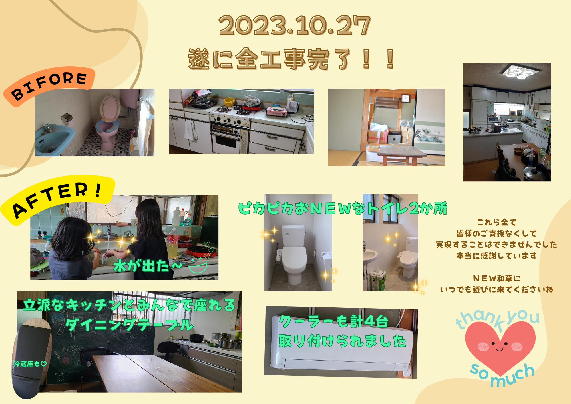 2024/02/26 13:02いつも応援下さりありがとうございます!最終リターンチェックにより一部漏れのあったリターンも発送を完了し、本日を持ちましてすべてのリターンが終了しましたことをご報告致します。なお、工事も昨年全てを完了し、NEW和草で子ども達は毎日快適にご機嫌に活動しております!水もトイレもキッチンもクーラーも皆様のご支援なくしては実現しなかった環境整備。日々有難さを感じております。たくさんの方にご支援頂きましたこと改めて厚く、熱く、御礼申し上げます。これからも和草はスタッフ・保護者一丸となって子ども達の未来の為の活動を続けて参ります。是非とも引き続き応援を宜しくお願い致します。※リターンの履行は全て完了しておりますが、たわわ食堂の各種チケットをお選び頂きご支援くださった方の中には、まだご来店がない方も多くいらっしゃいます。3月末まで有効ですので、お心当たりのある方は是非ご来店お待ちしております!フリースクール和草 担当:さわ もっと見る