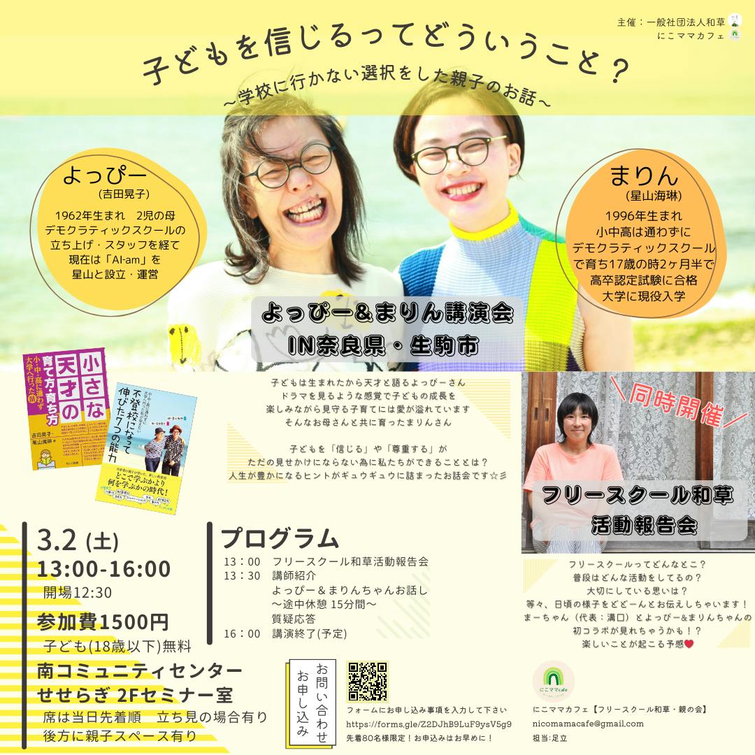 2024/02/26 16:37いつも応援ありがとうございます!クラウドファンディング終了後にも子どもの明るい未来の為に様々な活動に取り組んでいます!最近の一般社団法人和草の活動をいくつかご紹介します☆●にこママカフェフリースクール和草・親の会「にこママカフェ」では、毎月第二金曜にお茶会をしています。不登校に悩む親御さんをはじめ、子育て世代の悩みを何でも共有できる場として広く活動しています。そして今回初めて、和草&にこママカフェ主催で、ゲストを招いての特別イベントを開催することになりました。子どもを信じるってどういうこと?~学校に行かない選択をした親子のお話~+2023年度フリースクール和草活動報告会クラウドファンディング終了後、初の大型イベント開催にワクワクしています!子ども達を取り巻く環境の目まぐるしい変化に、私たち大人がついていく為には、今までの価値観をひっくり返すくらいの出会いが必須!!と日々感じている私たちが選んだ講師は「不登校になって伸びた7つの能力」の著者でもある、 吉田晃子(よっぴー)さん、星山海琳(まりん)さん親子です。決して誰も何も否定せず、そのままありのままを肯定しつつ、新しい価値観で世界を捉えて自分も楽に生きる知恵がたくさん詰まった講演会になると思います!アーーンド、クラファンのまとめも兼ねての2023年フリースクール和草活動報告会も同時開催です!こちらもキラキラが溢れる子ども達の様子を見て頂ける内容です。今週末の開催ですので、是非お越しくださいね!お申し込みはコチラ●大人フリースクール「道草農園」五反原の里で自然農を通じて多様な人が集える居場所作りをしています。毎月 第二月曜日 10時~毎月 第四日曜日 10時~どちらも大人一人500円で自由に参加できます!参加希望の方は和草ホームページかInstagramからご連絡下さいね!和草ホームページ道草農園Instagram●高校生民泊「しおのめハウス」生駒駅の駅前に遂にオープンした「しおのめハウス」ぞくぞくとご予約を頂いております!宿泊以外にもスペースを利用したイベントも開催しております。是非お気軽に遊びに来てくださいね。詳細はコチラ↓しおのめハウス もっと見る