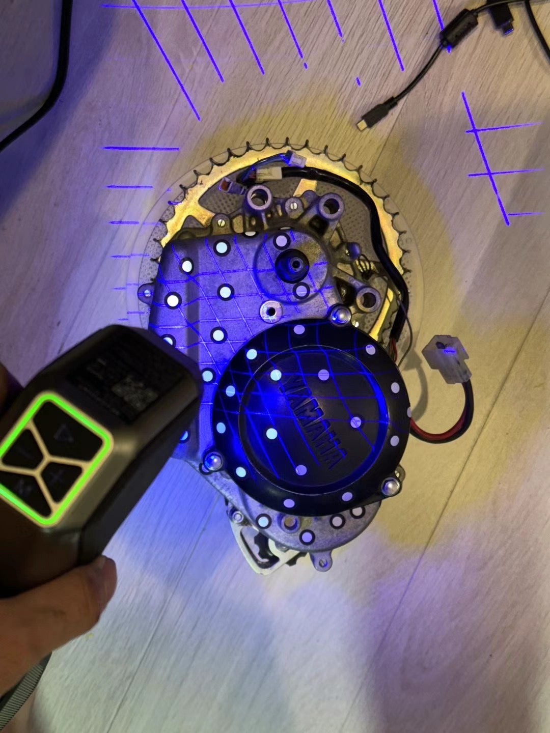 14本の交差ラインモードを使用して電動自転車の部品をスキャンしました。レーザーモードでスキャンスプレーを不要で、黒いと金属部品も対応できます。