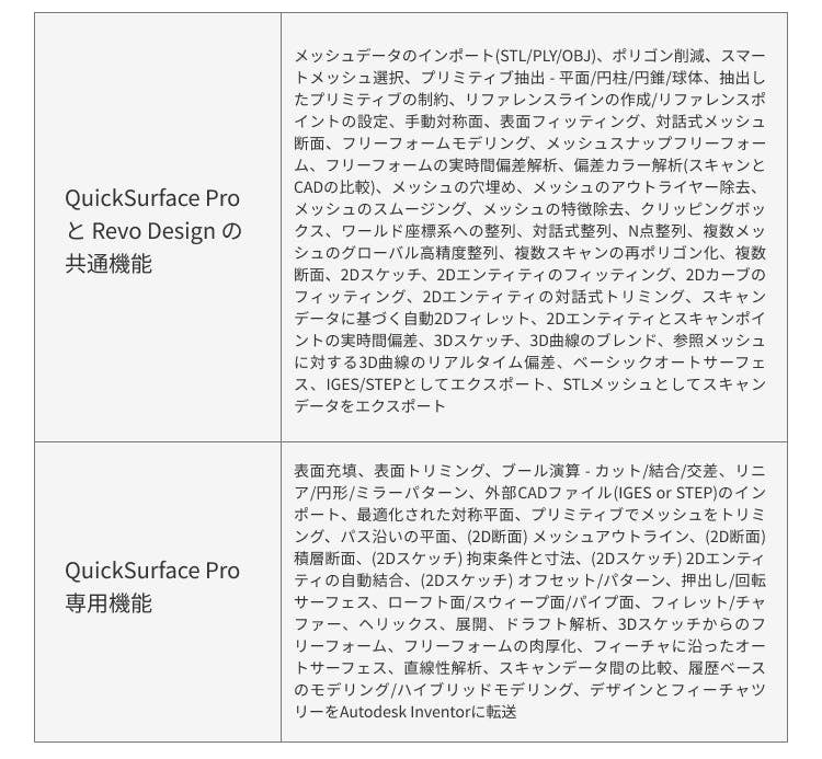 モデルに対してより詳細な処理を行うための追加機能が必要な場合は、QuickSurface Proのご購入をお勧めします。Revo Designの基本機能を全て含みつつ、さらに高度な機能を多数追加。以下の比較図をご参照ください。