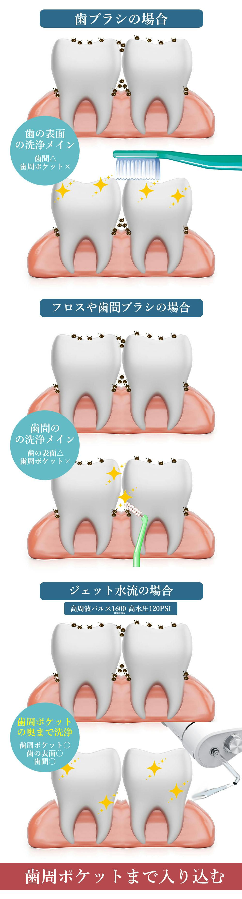 食後の使用や、特に汚れている時に適しています。歯の隙間に深く残った残留物を取り除きます。