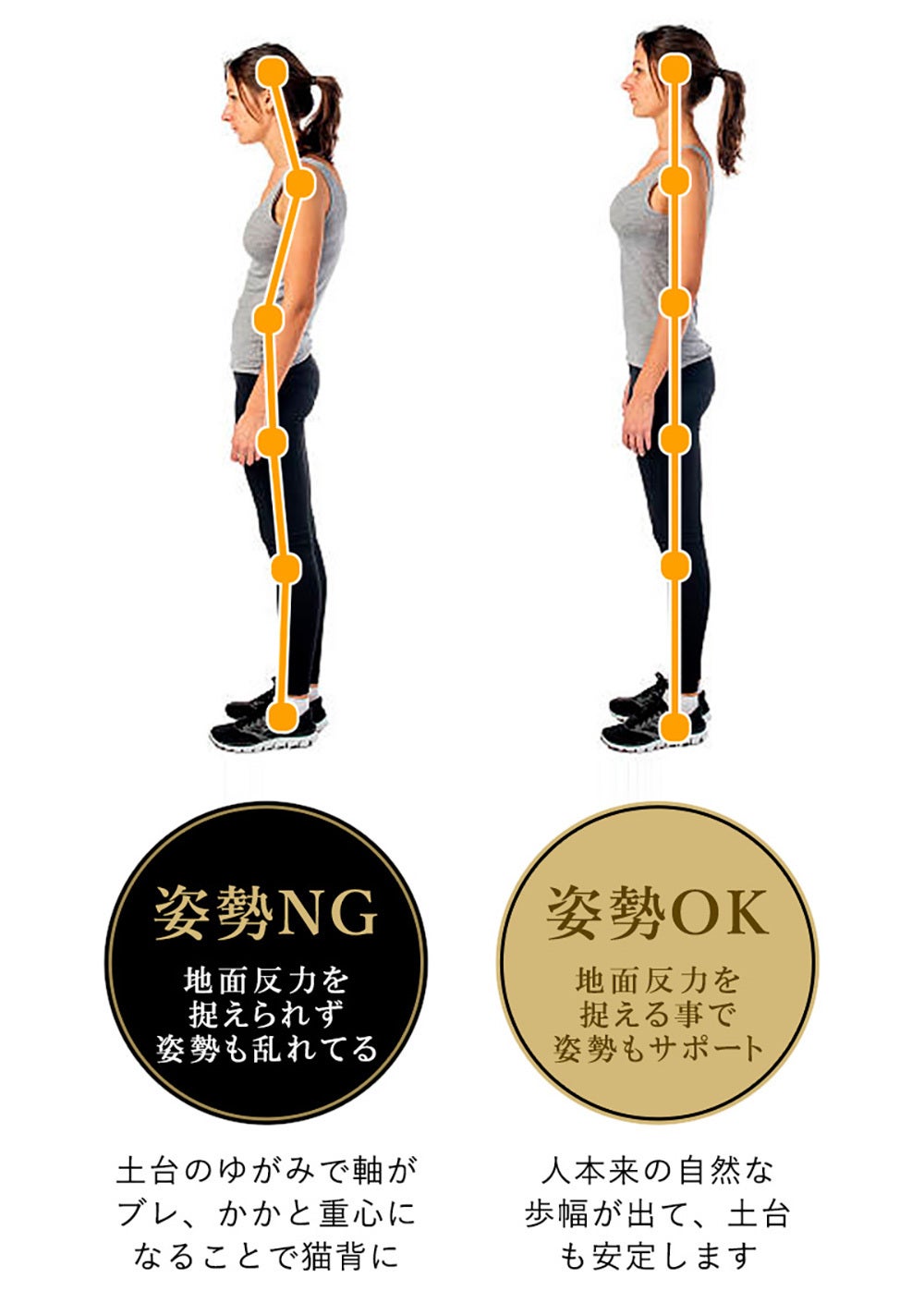 ②足裏のアーチをサポート、地面反力を155%アップして歩行をサポート