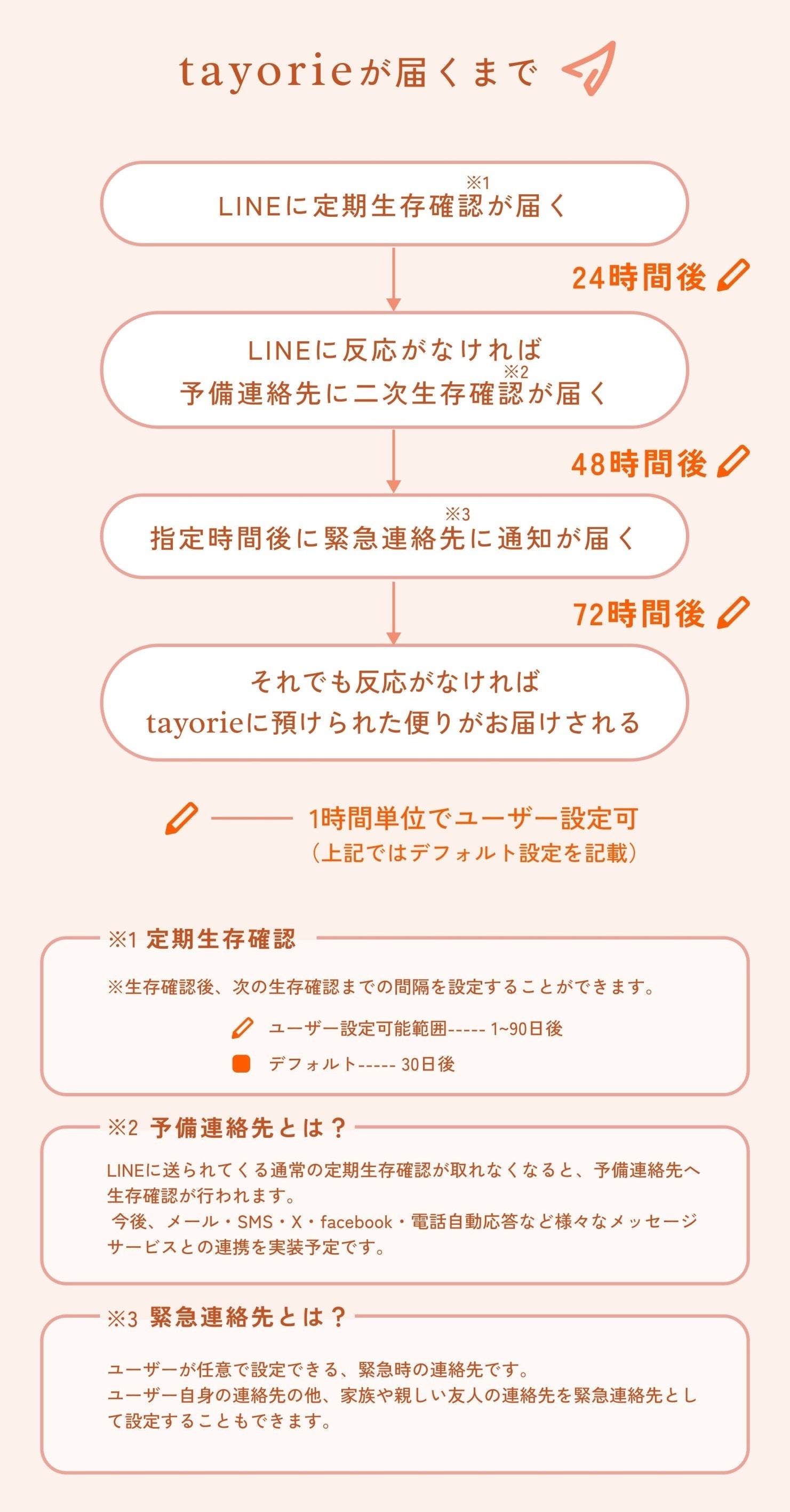 tayorieは、特許出願済みの独自のシステムを使ってユーザーの生存確認を定期的に行い、規定の条件を満たし死亡判定が為されると、ユーザーが生前登録していた任意の相手に訃報と最後の便りがお届けされる自動訃報送信サービスです。
