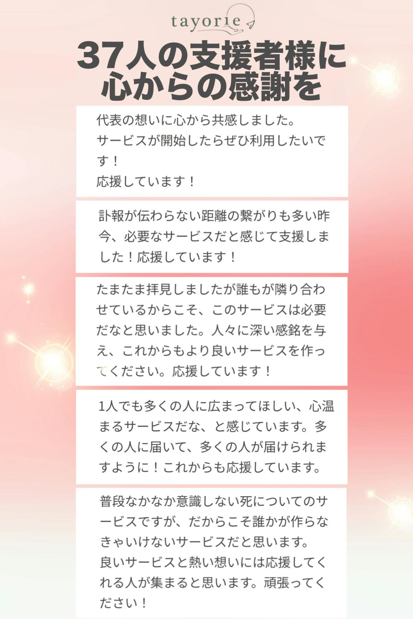 現在、tayorie〝たよりえ〟という、自分が死んでしまった時に訃報と最後の便りを自動で送信できるサービスの正式版を制作するため、クラファンに挑戦中です。