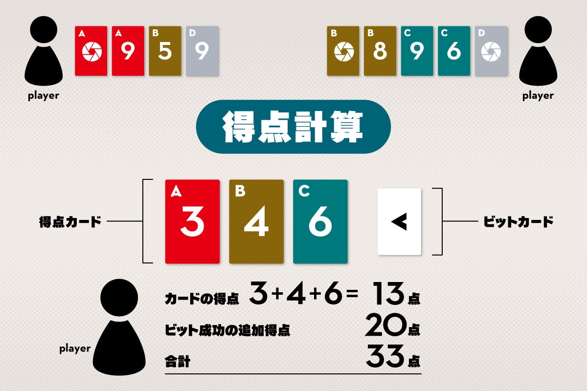 その得点が、先ほどのビットカードと一致していたら(あるいは「予想しない」カードを出していたら)追加得点を得ることができます。
