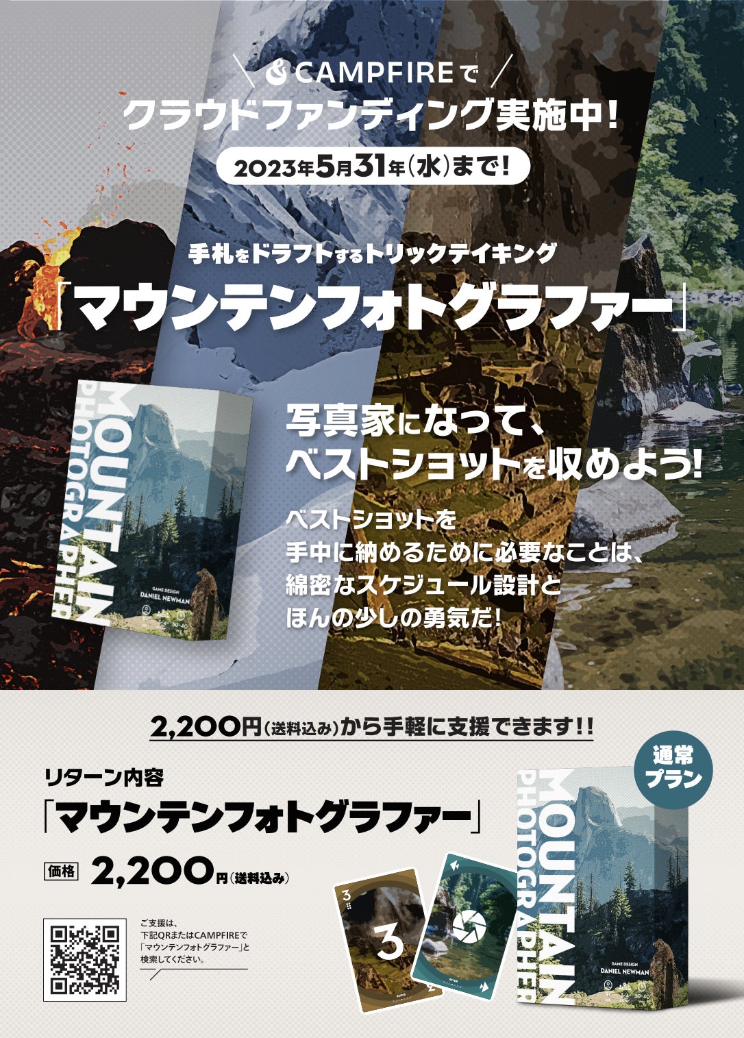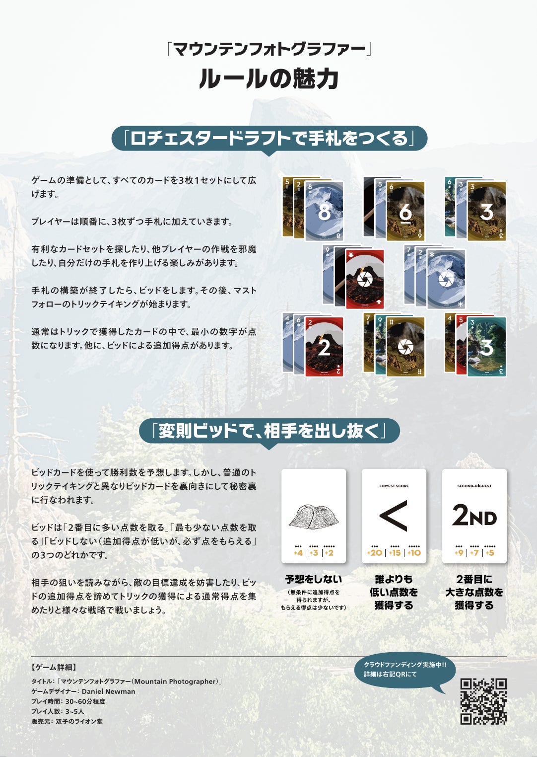 いまクラウドファンディングを行っている「手札をドラフトするトリックテイキング「マウンテンフォトグラファー」」のことを、より多くの方に知っていただくために、特別なチラシを作りました!