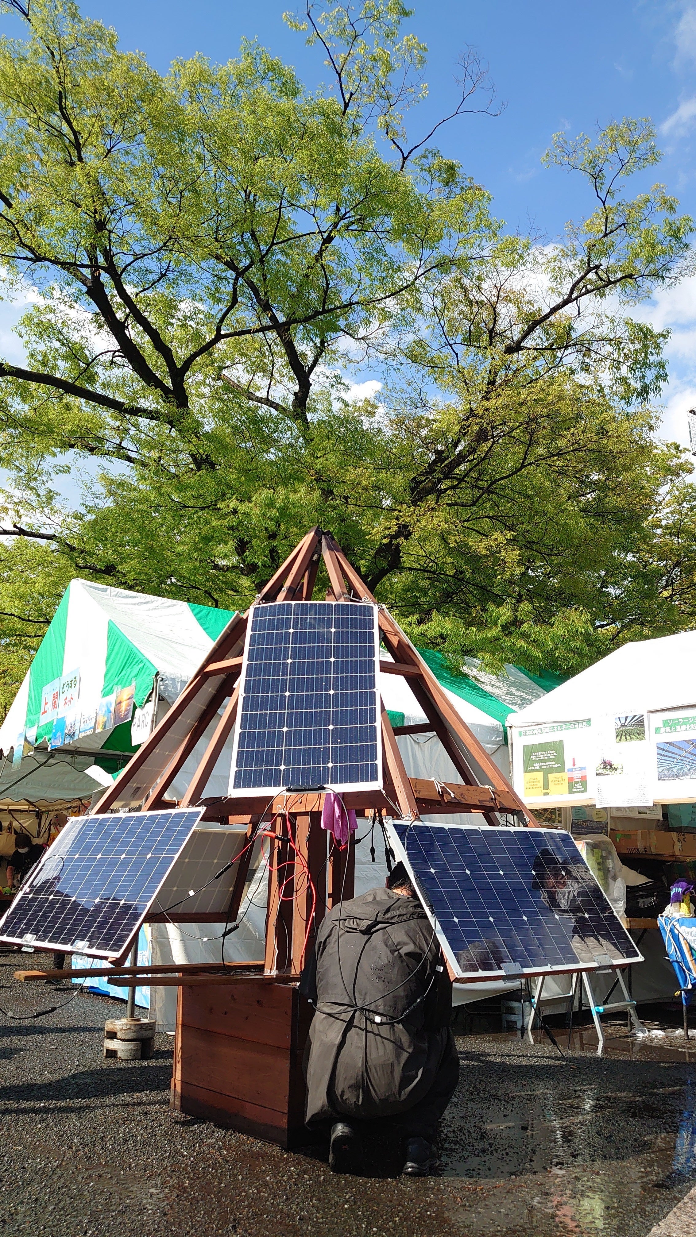 ソーラーツリーのクラウドファンディングにご協力くださった皆様。改めまして、ありがとうございます。4月のアースデイ2023での本番展示以後も、ソーラーツリーはあちこちで展示されてきました。そして、この9月には多くのソーラーツリー展示イベントがあります。そして、10月、11月、12月も。「移動設置型太陽光発電設備」としては、たぶん世界で初めて登場した「ソーラーツリー」(発電規模800W)ですが、今後もあちこちのイベントに登場しますので、ぜひ会いにきてください!*冒頭写真は町田バイオセンターでの展示の様子川崎と町田のイベントに登場5月21日(日)には川崎・溝の口駅での「かわさき公害フェスタ」、7月8日(土)には町田バイオエネルギーセンター(ごみ焼却センター)での「3Rまなびフェスタ」でソーラーツリーが展示されました。川崎ではJR溝ノ口駅の出口付近に展示され、駅を乗り降りする多くの人がソーラーツリーを目撃することになりました。町田では逆に人通りのないゴミ焼却場の一角でした。ここでは目的を持ってバイオエネルギーセンターに来る人としか出会えません。来訪者は200人ちょっとでしたが、実はこのイベントを支えていた何十人もの大学生たちと出会えました。大学生たちは組み立てや、搬入搬出も手伝ってくれて、溝ノ口駅で通り過ぎた人たちとは違う濃密なつながりができたように思います。駅前の雑踏の中から見えるソーラーツリー町田バイオマスセンターではちょうど七夕と一日違いでしたが、「環境に関するお願い」を書いた短冊をツリーにぶら下げるというアクションをしました。その場での呼びかけだったので、短冊はそんなに多くはありませんでしたが、子供たちは楽しく応じてくれました。ソーラーツリーイベントのヒントをいただいた感じです。ソーラーツリーで七夕アクション台座のバラバラ事件実は川崎での展示後の片付けの最中に、台座バラバラ事件が起きました。ソーラーツリーの部品の中で最もかさばるのが台座です。柱を乗せている大きな箱で、中に水を入れたポリタンク5つが入っていて、ソーラーツリーが風に飛ばされることのないように守っています。この台座を台車に乗せて移動中に、急いでスピードを上げたスタッフが、横断歩道の段差に台車をぶつけ、乗っていた代車が激しく落ちてしまったのです。台座は4つの板がネジで留めてあるだけなので、歩道に落ちて見事にバラバラになってしまいました。これはある意味、ソーラーツリーの弱点を早めに知らせてくれた啓示とも言えます。台座に乗ったりして作業するので、この弱さは補強しなければということになりました。まずビス留めだけでは心もとないので、内側からL字金具で補強しました。それでも、町田でのイベントではグラグラして弱いと感じたので、さらに外側からも補強しました。何度も組み立ててはバラしてを繰り返す中で、どことどこの位置が最も組み立てやすいのかなどの実地訓練となり、組み立てマニュアルも充実してきました。町田イベントの参加者の中に建築家の方がいて、いろいろ不備があるけど、もっと精密に設計して「市販品」にできるようにしたいと言ってくださる方も現れました。バラバラになった台座今後のイベント出展予定は満載ソーラーツリーは「木」なので、東西南北に太陽光発電パネルをつけています。ふつう発電所では南側を中心にパネルをつけますが、それでは「木」にならないのです。北側のパネルなんか発電しないと思われるかもしれませんが、お天気は毎日晴れではありません。曇りの日には南も北もありません。雲の中を乱反射した太陽光線により南北パネルとも同じように発電しています。町田でのイベントは強い曇りでしたが、太陽光パネル接続時に1%程度に減っていた蓄電池の電気が、終わる頃には49%に達していました。500Whの小さな蓄電池ですが、5時間足らずでこうですから、朝から夕方までなら曇りでも100%行けそうだなと感じました。そんなソーラーツリーをじっくり見るチャンスが、今後も続々あります。以下、一覧でお示ししますので、お近くの方はどうぞ出会いにきてください。9月9日(土)10時〜15時 江ノ島でエコフェスタin江ノ島。11時から発電所づくり相談会、13時からソーラーツリーの仕組みを説明するツアー、14時から「エコ作と節電」のお話。15時終了です。https://lit.link/ecofesenoshima9月18日(月)10時〜16時 ワタシのミライ「NO NUKES & NO FOSSIL再エネ100%と公正な社会を目指して」2023.9.18 集会& パレード会場:代々木公園B地区(アースデイの会場と一緒です。)https://watashinomirai.org/20230918_nnnf/9月23日(土)、24日(日)10時〜21時 中津川ソーラー武道館中津川 THE SOLAR BUDOKAN 2023会場:岐阜県中津川公園内特設ステージhttp://solarbudokan.com/2023/9月30日(土)おひさまフェス×星空上映会inかわさき会場:at二ヶ領せせらぎ館前の多摩川河川敷(最寄駅は登戸)https://ohisamahoshizora.mystrikingly.com/?fbclid=IwAR0aaq-m7ie_lyI7C5NV-DseEHHXNql_Ymk7yONMKH-v1Je3yLmxCqwV4e410月28日