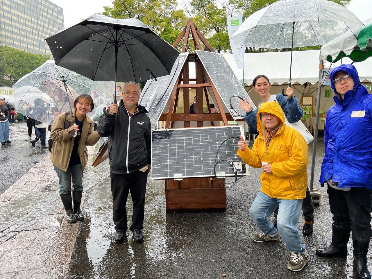 2023年4月15日、本日雨、それも本格的雨!それでも朝7時30分から、代々木公園へ。ふりしきる雨の中、朝8時頃からソーラーツリー を組み立てました。市民電力連絡会のブースの前に、その姿を現しました。
