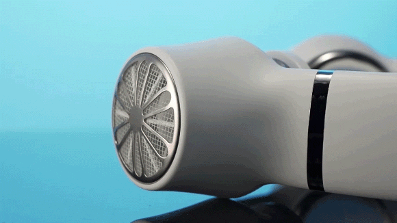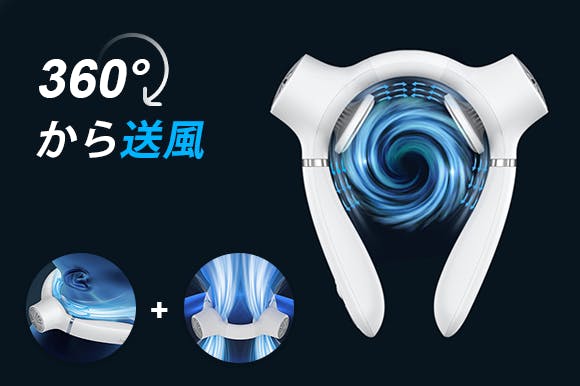 FB08はファンレス設計で、空気吸引口のタービンが回転して空気を吸い込み、送風口から風を送り出します。これにより、360°からのパワフルな風で涼むことができます。