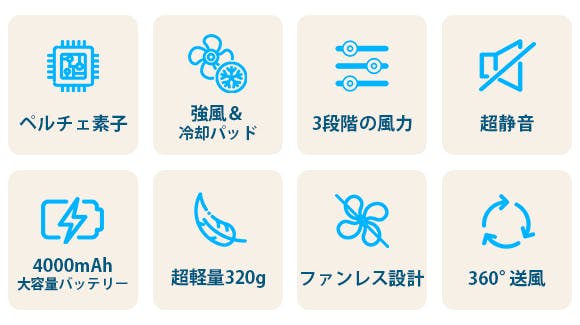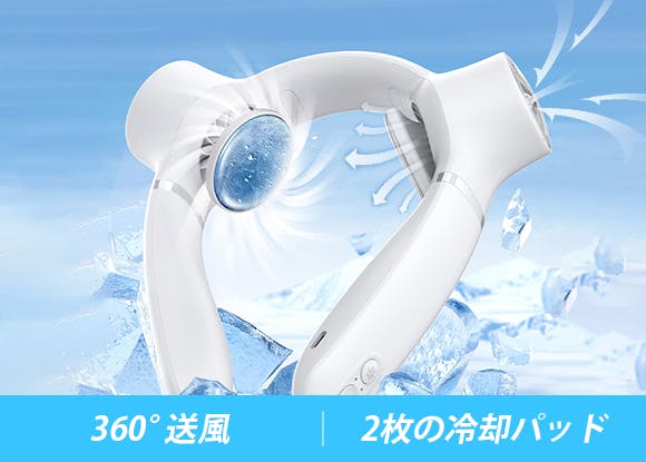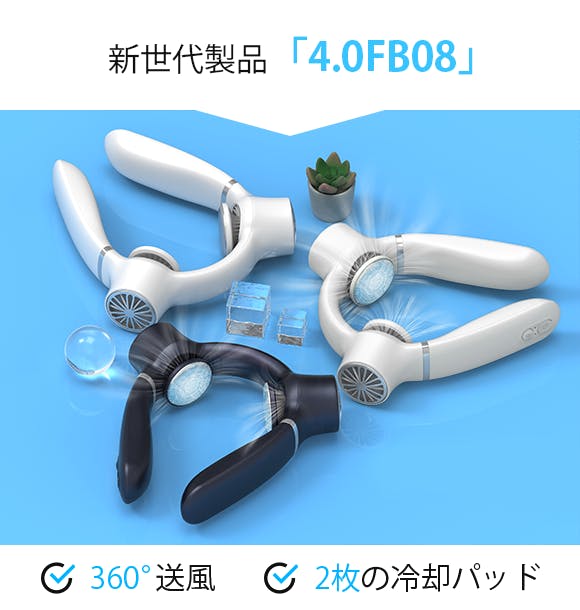 FB08は360°からの送風に2枚の冷却パッドをプラスした強力冷却で、よりすばやく効果的に涼しさを感じることができます。