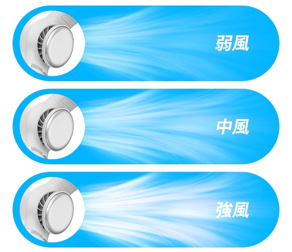 風の強さは3段階あり、電源ボタンを短押しするだけで切り換えられます。オフィス作業や勉強、買い物、運動など、暑さに合わせてお選びください。