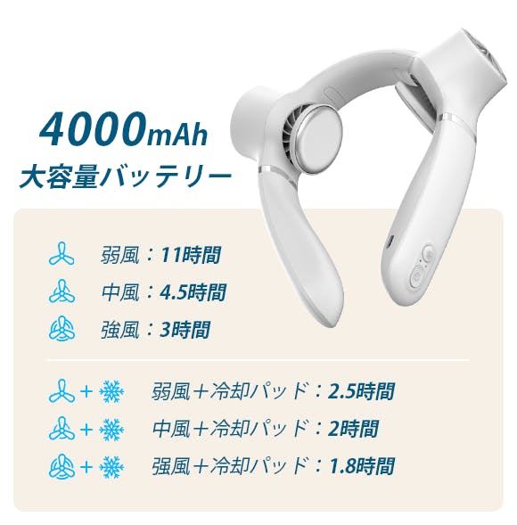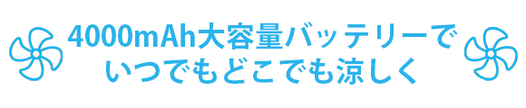 4000mAhの大容量バッテリーを内蔵しており、弱風モードのみなら11時間連続使用が可能です。屋外のバーベキューやキャンプでも、朝から晩まで涼しさを感じることができます。