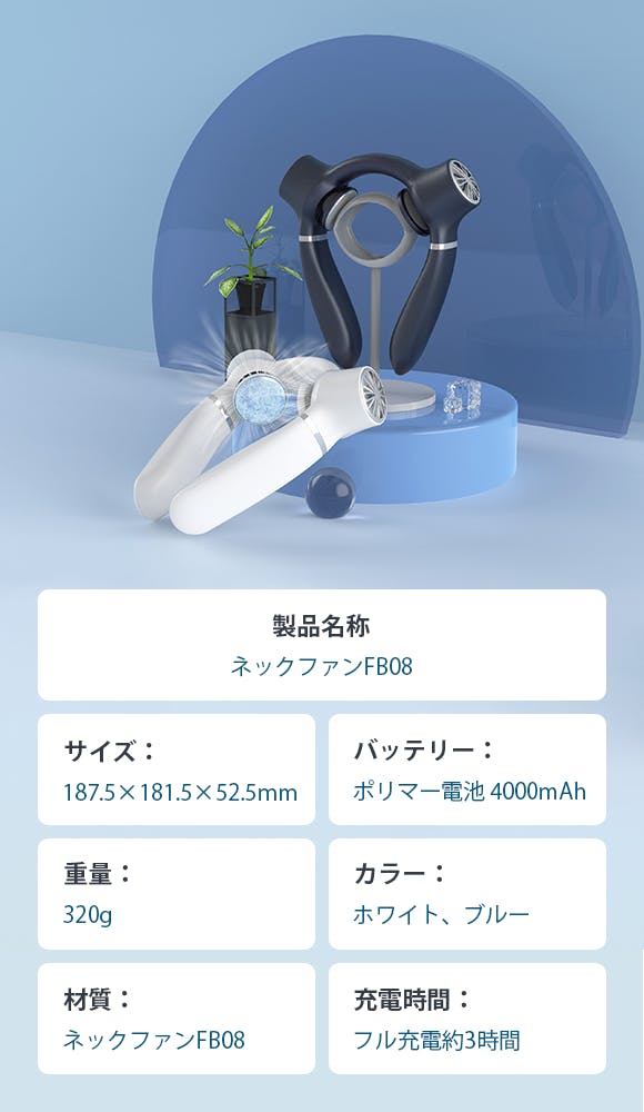 「FB08」は360°からの送風と冷却パッドですばやく涼しさをお届けするネックファンです。首掛け式で両手が使えますので、夏の買い物や屋外での作業などにおすすめ。夏の必需品、FB08をぜひお試しください!