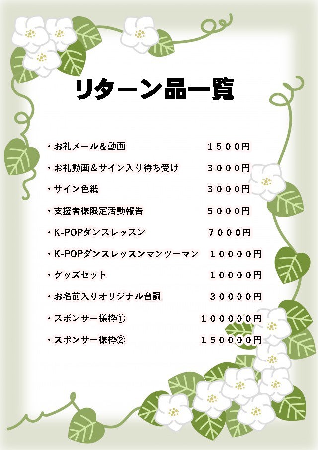 リターンにはダンスレッスンや初製作となるグッズのリターンなど数多くご用意させていただきました。
