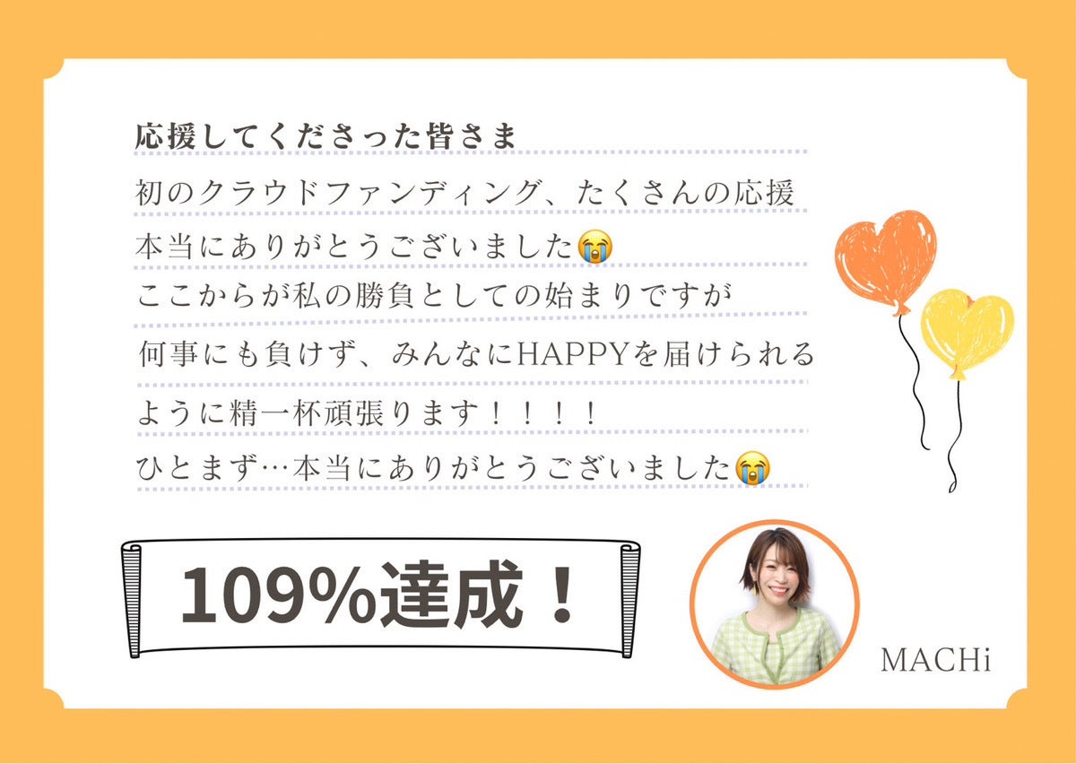 2023/05/01 11:26クラウドファンディング、109%達成!!!本当に本当にありがとうございました!!!3月21日より始まったこのクラファン企画。長いようで短かった期間でしたーーー。急遽この企画が立ち上がり、走り抜けるようにクラファン準備し突如始まったクラファン。あまりに急なことに、不安だけが心を覆っていました…少しでも楽しんでもらえるように。ダンスを好きになってもらえるように。この企画が誰かの勇気やパワーに繋がるように。そう思いながら、リターン品を準備したり日々を過ごしていました。途中本当に心が折れそうになりましたが、皆さまの応援やご支援あって、なんとか、なんとか気持ちを持ち直すことができました。873,500円という大きな金額が集まりました。本当にありがとうございます! ここからが私の勝負としての始まりです。まだまだ始まったばかりですが、何事にも負けず楽しんで前に進みたいと思います!たくさんの人たちに、何か届きますように✌︎('ω'✌︎ )引き続きどうぞよろしくお願いします!!MACHi もっと見る