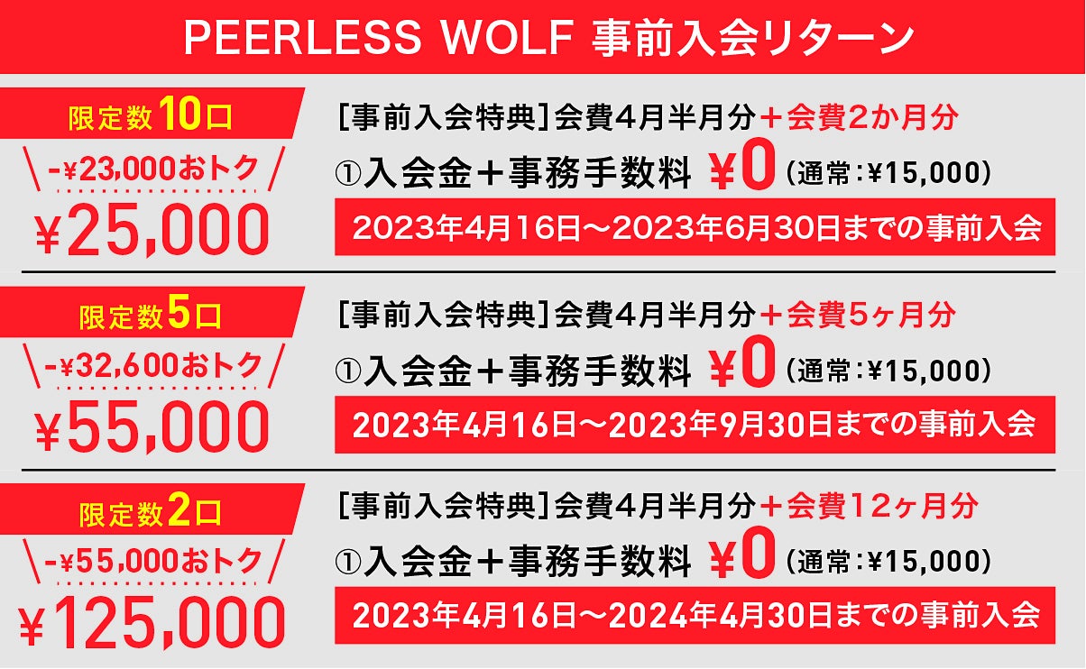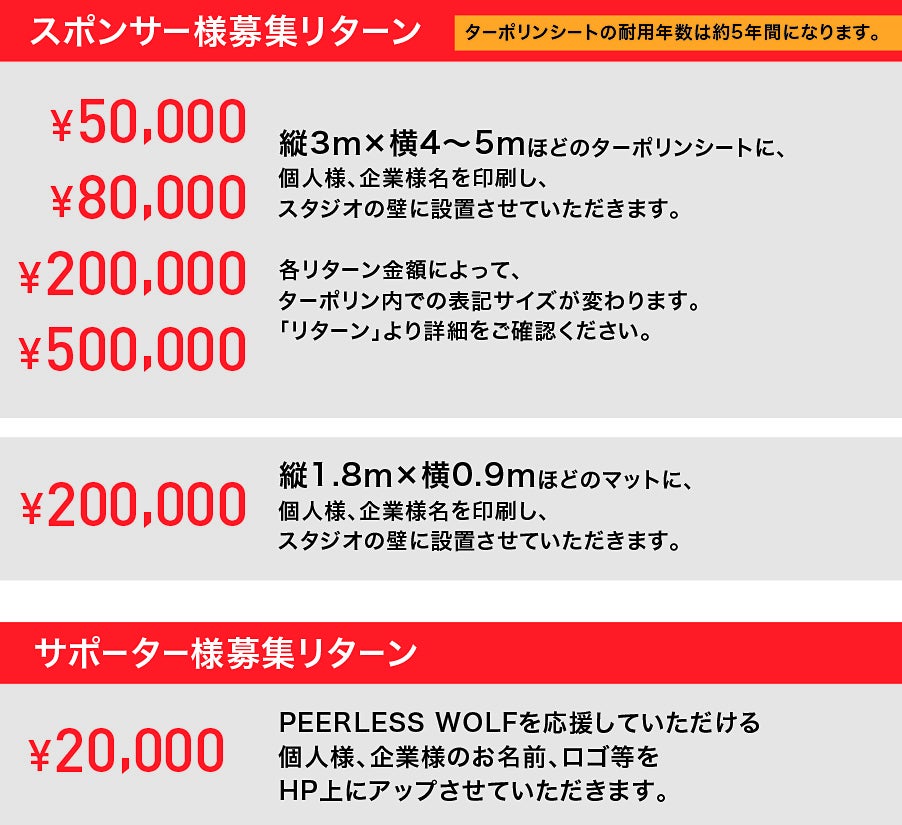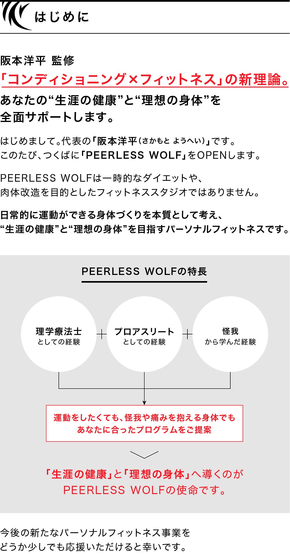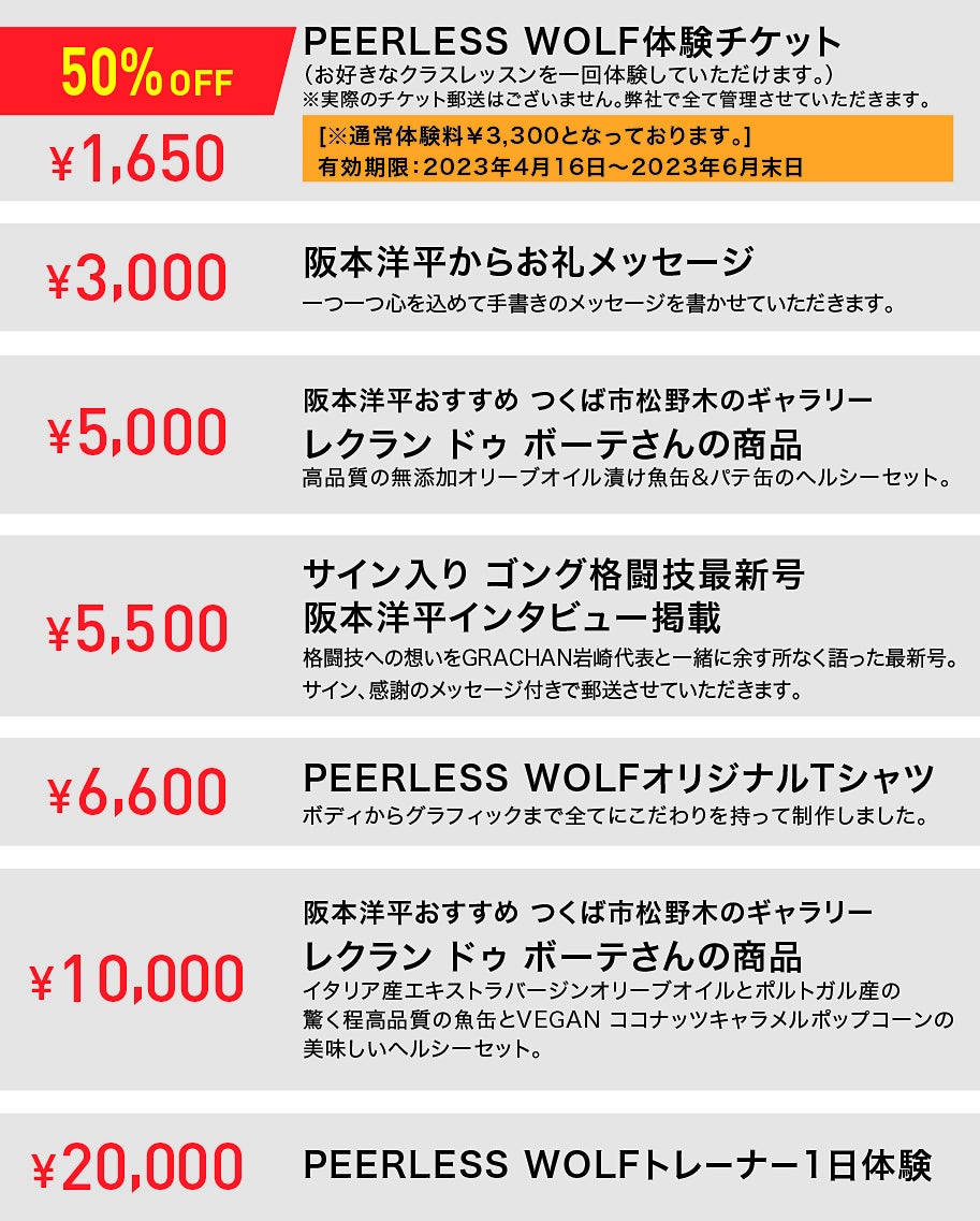 「理学療法士として得たキャリア」と「プロアスリート」としての全ての財産を、今度は「PEERLESS WOLF」という形でみなさまの「身体の健康と人の幸せ」「格闘技と人の内面の変革」に注ぐためにスタジオを設立する決意をしました。「PEERLESS WOLF」がみなさまの人生の財産になれるよう、共に成長していける運営を目指して、少しでもお力をいただければ幸いです。