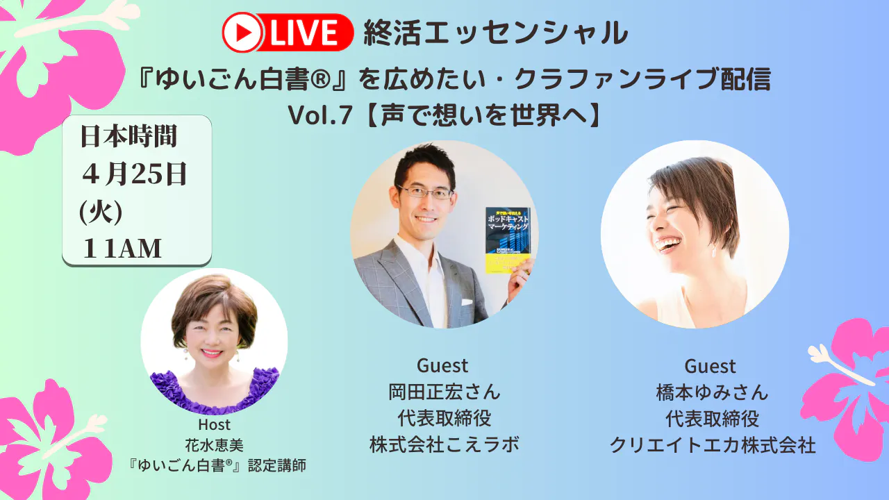 【声で想いを世界へ】ポッドキャストの配信のサポートをされている岡田正宏さんと「魂に目覚める魔法の知恵袋」ポッドキャスト番組をされている、リアルスピリチュアリストの橋本ゆみさんをゲストにお迎えして、『声』で想いを日本、そして世界へ配信する楽しさをシェアして頂きます。