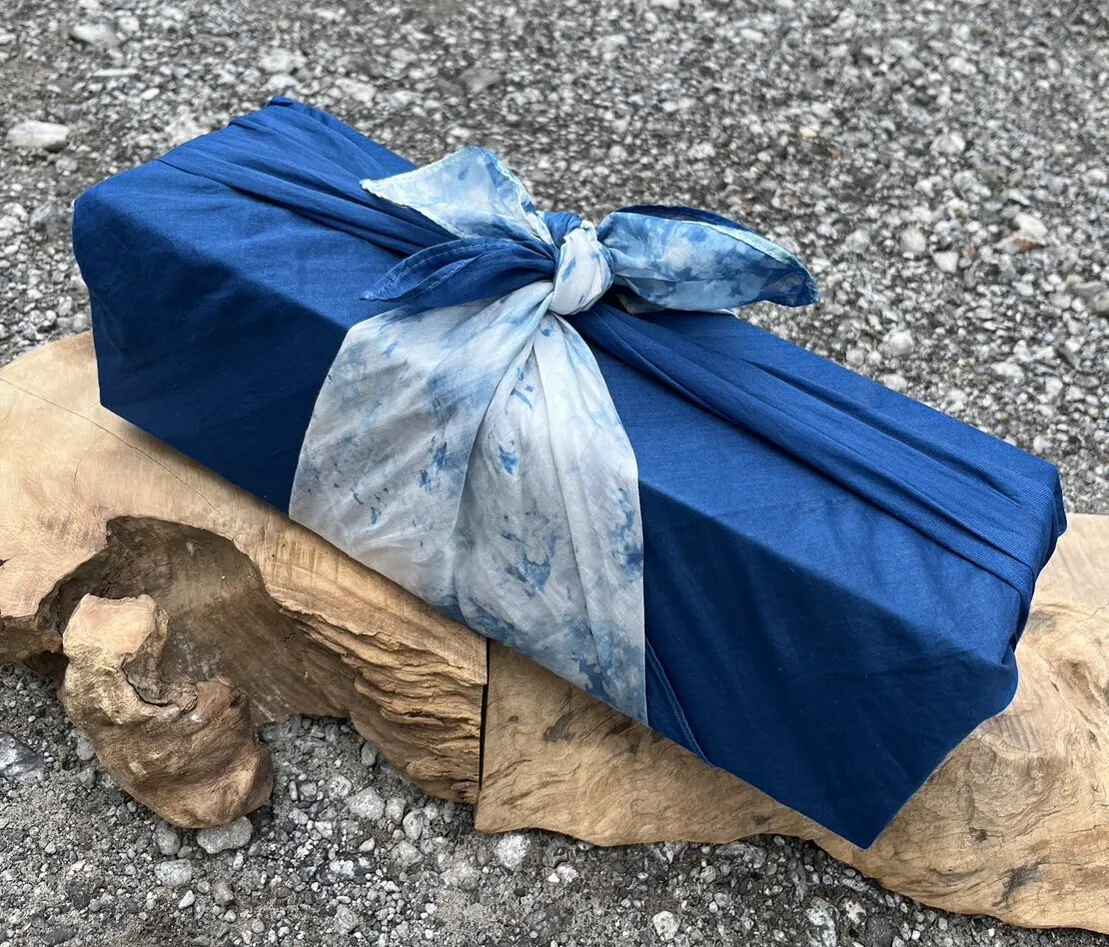 竜宮から引き上げられた熟成酒は、今回は特別な布で包まれてお届けいたします。その布は、自然から生み出される色とは思えないほど美しく神秘的な天然藍で染められています。この特別な藍染めは、常滑の小さな藍染め屋さんが「知多藍」と呼ばれる技法を使って丁寧に染め上げました。私たちは、自然と調和したこの素晴らしい「たまてばこ」を皆様のお手元にお届けいたします。