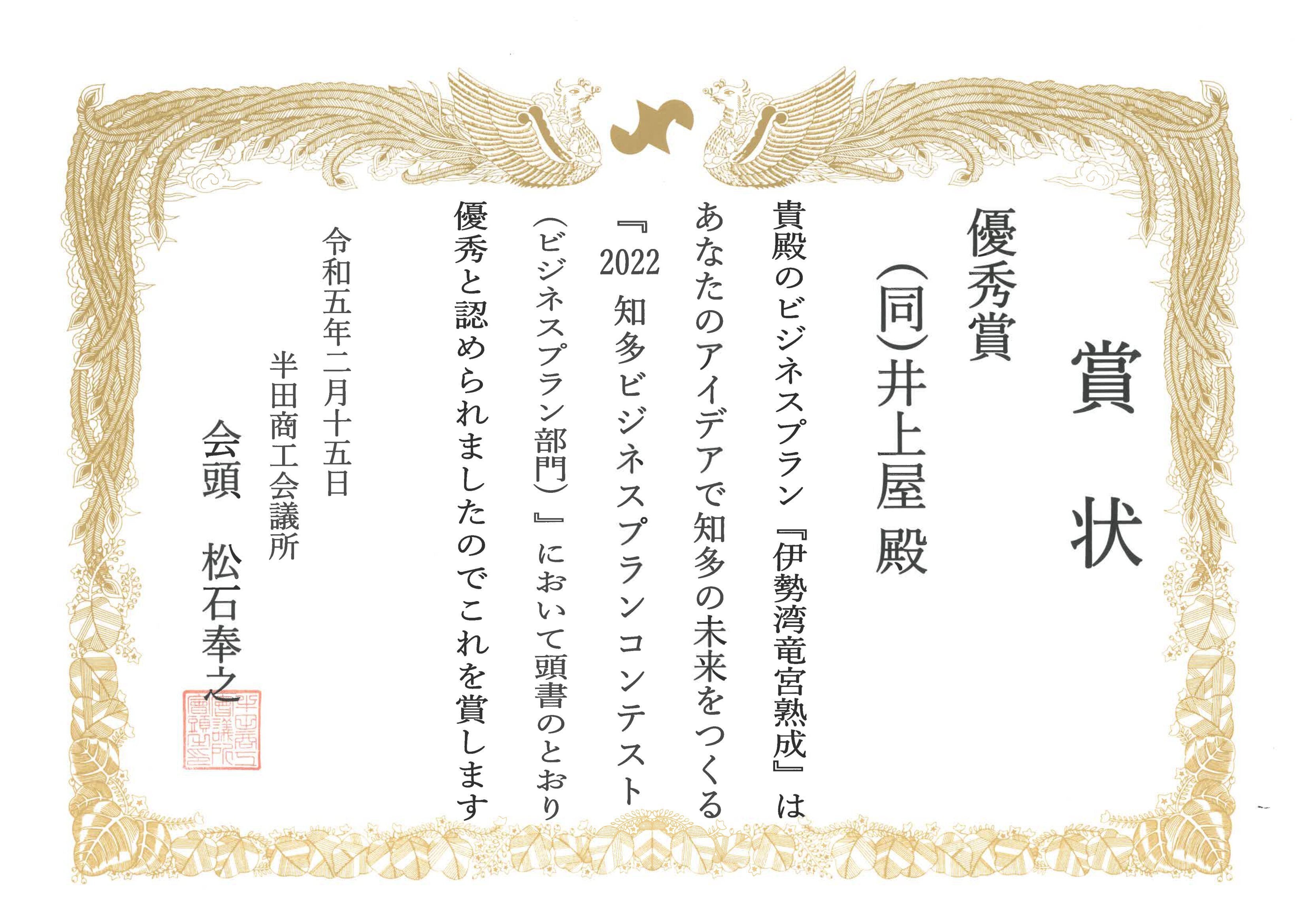 2022年知多ビジネスプランコンテスト(ビジネスプラン部門)において、半田商工会議所主催の優秀賞を受賞しました。これは今後の励みとなります。審査員の方からは観光ビジネスとの共有を進めるようにアドバイスをいただきました。小売酒販組合等と協力し、知多半島の飲食店にも卸していくことで拡大が期待できます。また、訪れる知多半島の観光客にも楽しんでもらえるパフォーマンスも検討しており、笑顔のあるビジネスを目指して取り組んでいきたいと考えています。