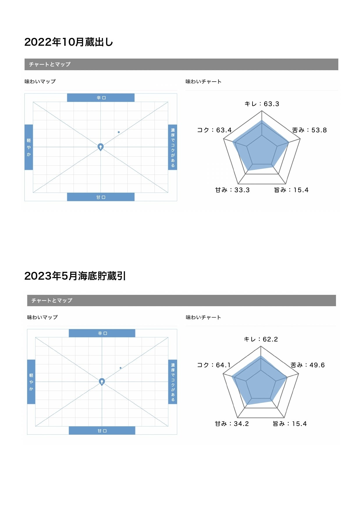 今回、伊勢湾竜宮熟成酒は官能的な要素だけでなく、「味の見える化」を実現するためにデジタル数値による味覚センサーを活用しました。このセンサーによって得られる味わいチャートは、5つの要素である「キレ・苦味・コク・甘味・旨味」を表示します。海底での熟成が持つ浪漫とエビデンスの両方から、唯一無二である海底熟成酒にこの味わいチャートを通じて確かな楽しみが心を掻き立てます。
