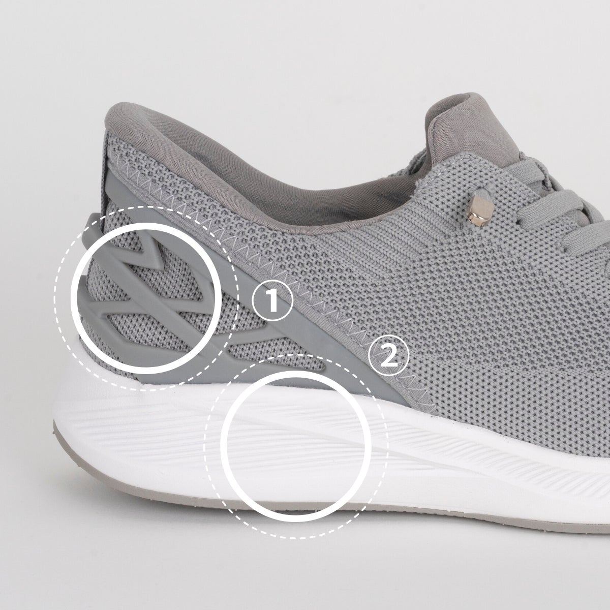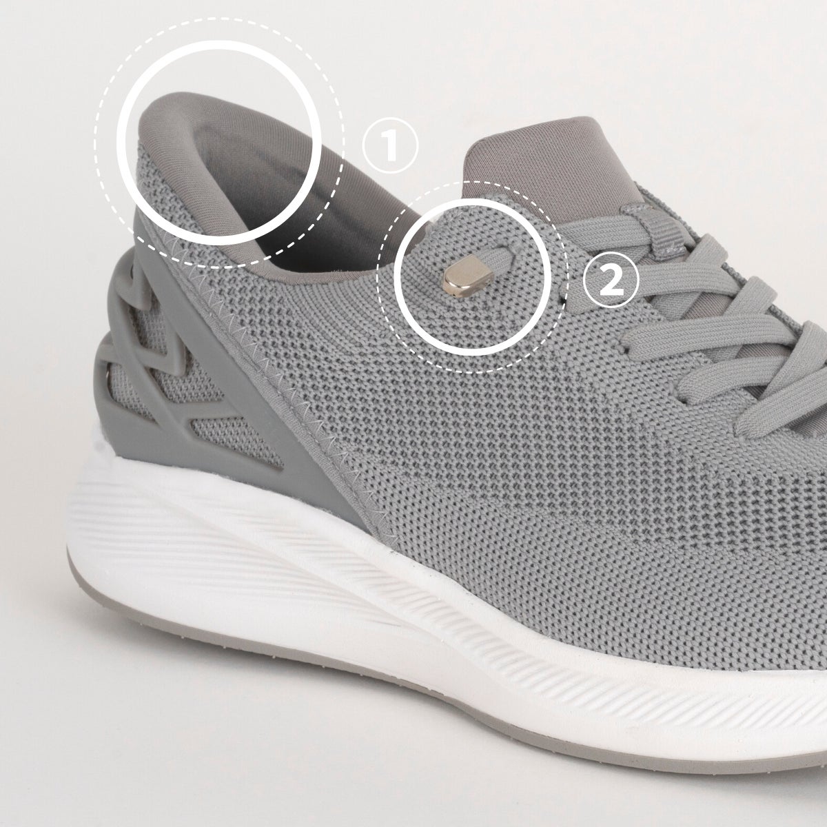 ①かかとに特殊なプラスチック構造を採用し、柔軟で反発力ある構造を実現しました。踏み込むだけで靴が履ける新感覚でクセになる履き心地です。