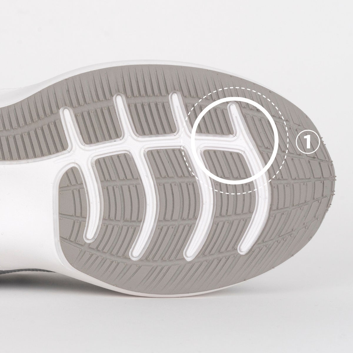①アウトソールは小さな溝がある設計で滑りにくい作りになっています。