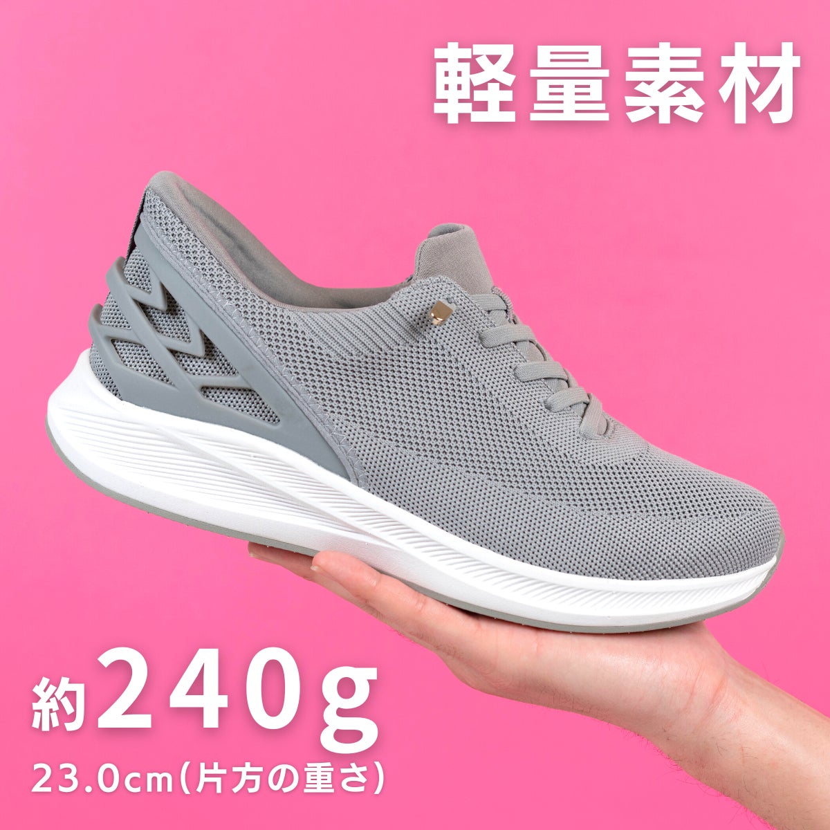 合成ニットでできたアッパー素材は柔らかく足によく馴染み、通気性がよく長時間はいてもムレにくい作りが特徴です。