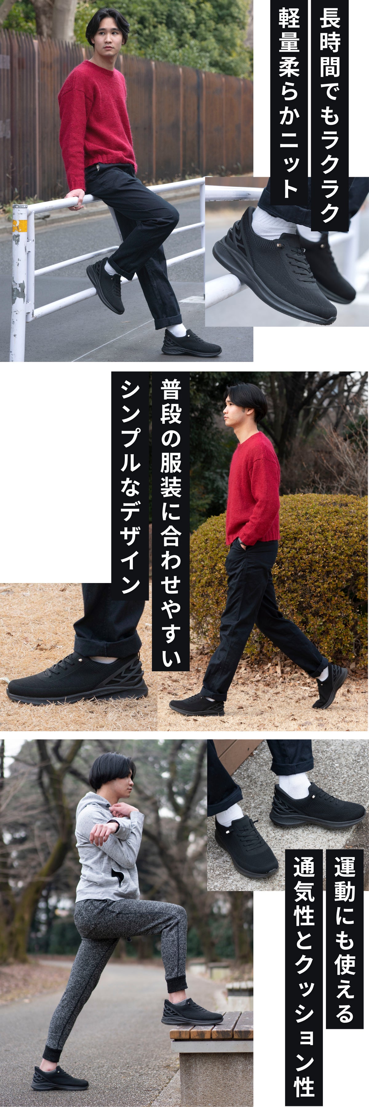 「もう朝の忙しい時間に靴を結びたくない!」紐を結ばずに一瞬で履けるシンプルなスニーカーがあったら面白い。という弊社デザイナーのそんなシンプルなアイデアから始まったスニーカープロジェクトは、コンセプト企画から、プロトタイプの作成など試行錯誤を重ね、社内チーム一丸となって開発に漕ぎ着けました。普段履きから運動などいつでも誰でも使える設計にこだわりました。