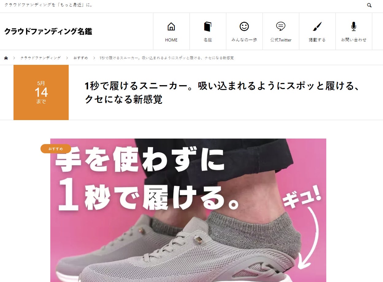 「クラウドファンディング名鑑」メディアにてMIREYA TOKYOの1秒で履けるスニーカーLAQUN(ラクーン)を取り上げていただきました。
