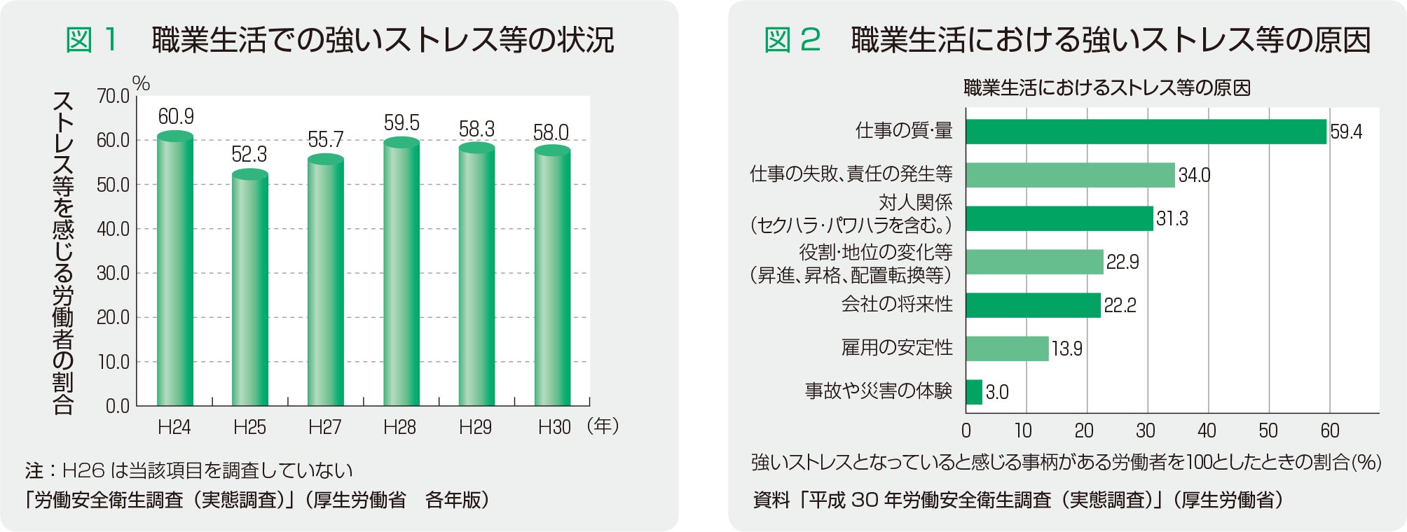 メンタルヘルスとは「精神面における健康」や「心の健康状態」を表す言葉です。身体の健康が大切なのはもちろん、心も元気であることは、仕事を進める上でも必要なことです。このところの社会環境の変化等で、心の健康を維持するのも、難しい時代になってきています。雇用情勢の変化とともに、 働く人の勤務形態や心理状態も変化を強いられて、多くの働く人が仕事や職業生活に関する強い不安、ストレス等を感じています。