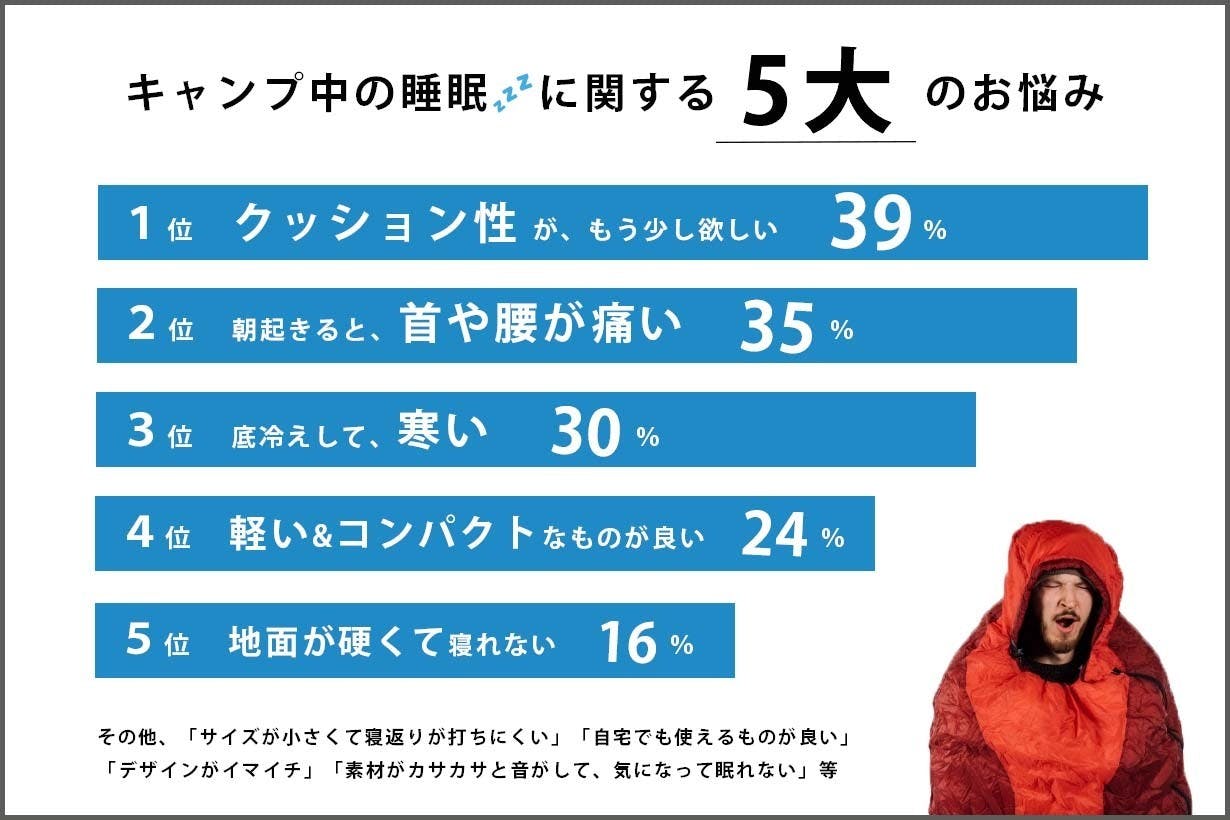 キャンプ中の睡眠は、地面の凹凸や、底冷えが気になって眠れなかったり、朝起きると、首や腰に痛みを感じたり。