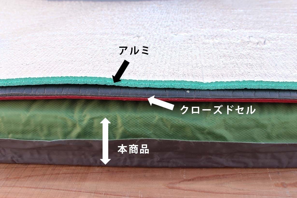 キャンプのシーンでは、マットレス1枚の上で寝るよりも、マットレスの上に寝袋などを敷いて寝ることも多いため、こんな風に寝袋を重ねるとちょうど良い厚みとなります。