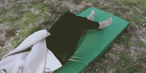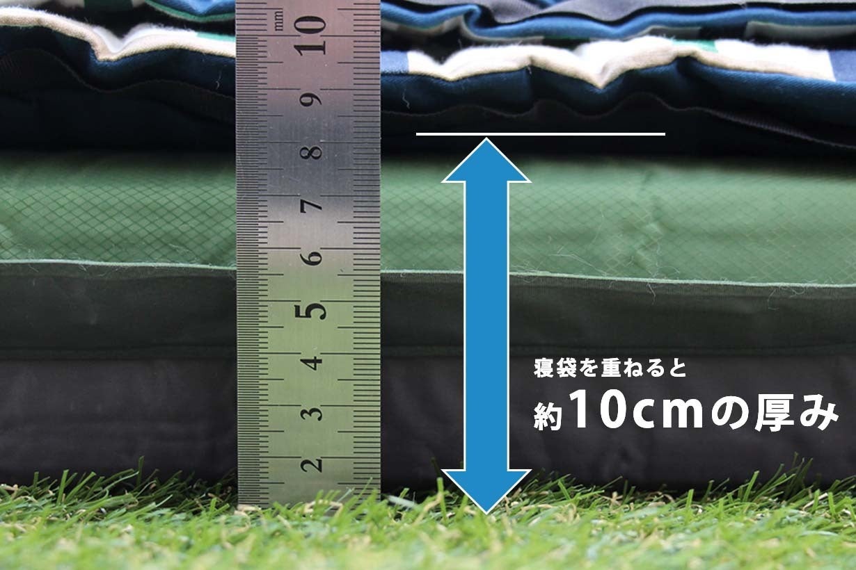 キャンプのシーンでは、マットレス1枚の上で寝るよりも、マットレスの上に寝袋などを敷いて寝ることも多いため、こんな風に寝袋を重ねるとちょうど良い厚みとなります。