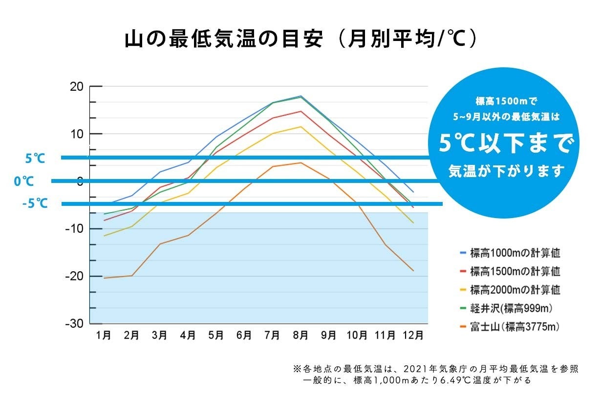 山の温度は、夏場でもひんやり。年間温度はこんな感じで、標高にもよりますが、夏場でも最低気温は5℃前後のことも。