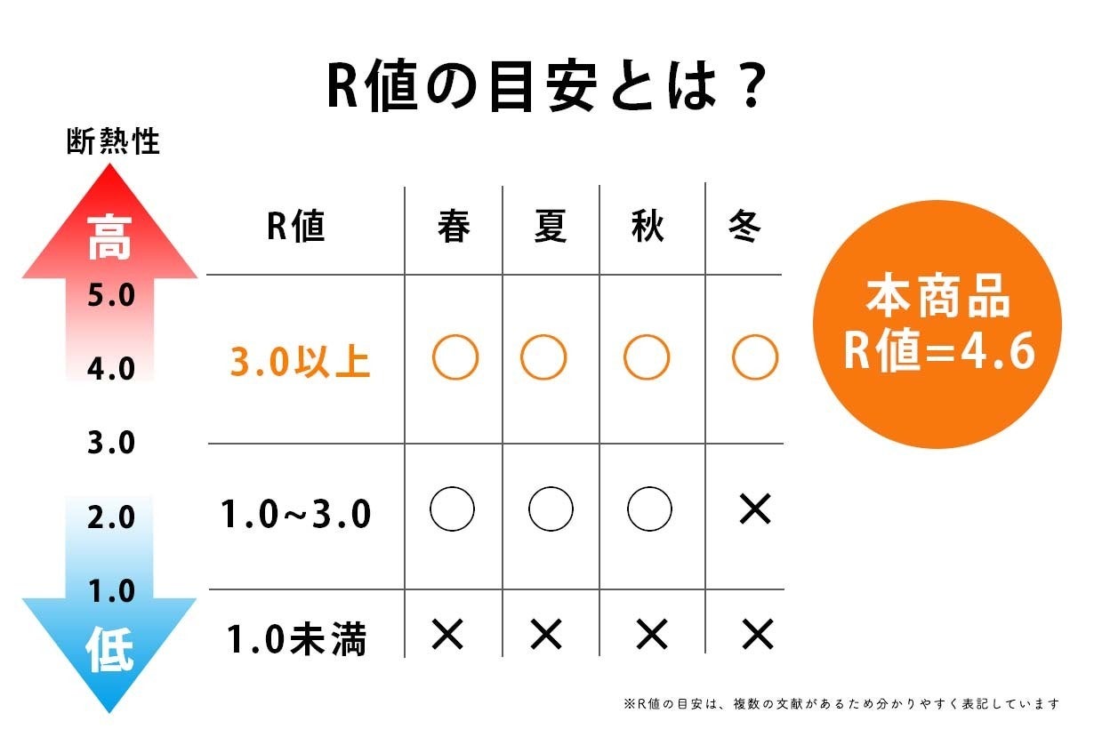 R値(R-value)とは、断熱性を表す数値のことです。R値が高いほど冷気が伝わりにくく、断熱性能が高いマットということになります。